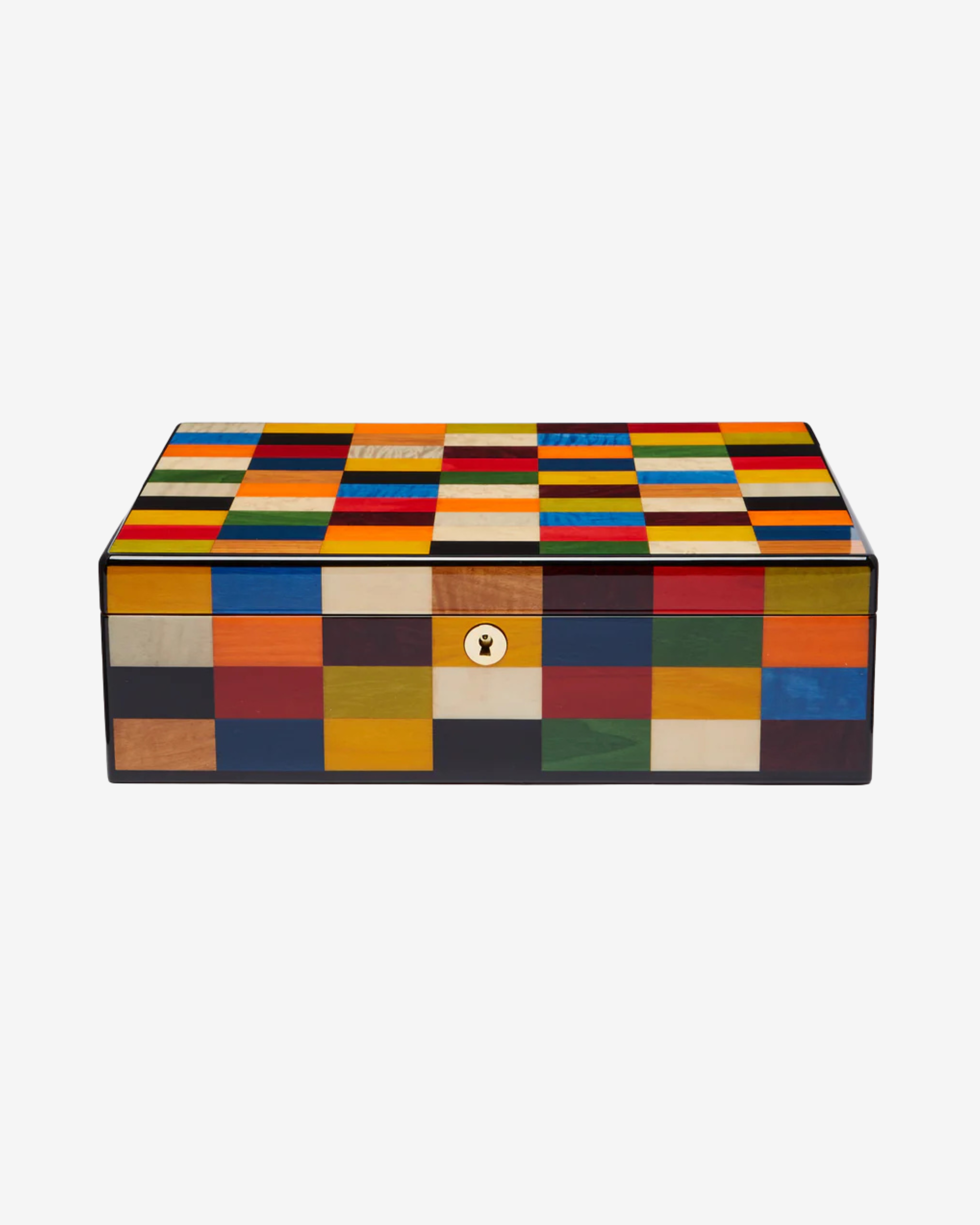 Handcrafted in Italy, this Wood Inlay Jewellery Box pairs vibrant geometric wood inlays with a high-gloss lacquered finish and plush Alcantara-lined compartments—complete with a gold-toned lock and key, it’s a timeless gift for marking milestones or treasuring personal keepsakes.