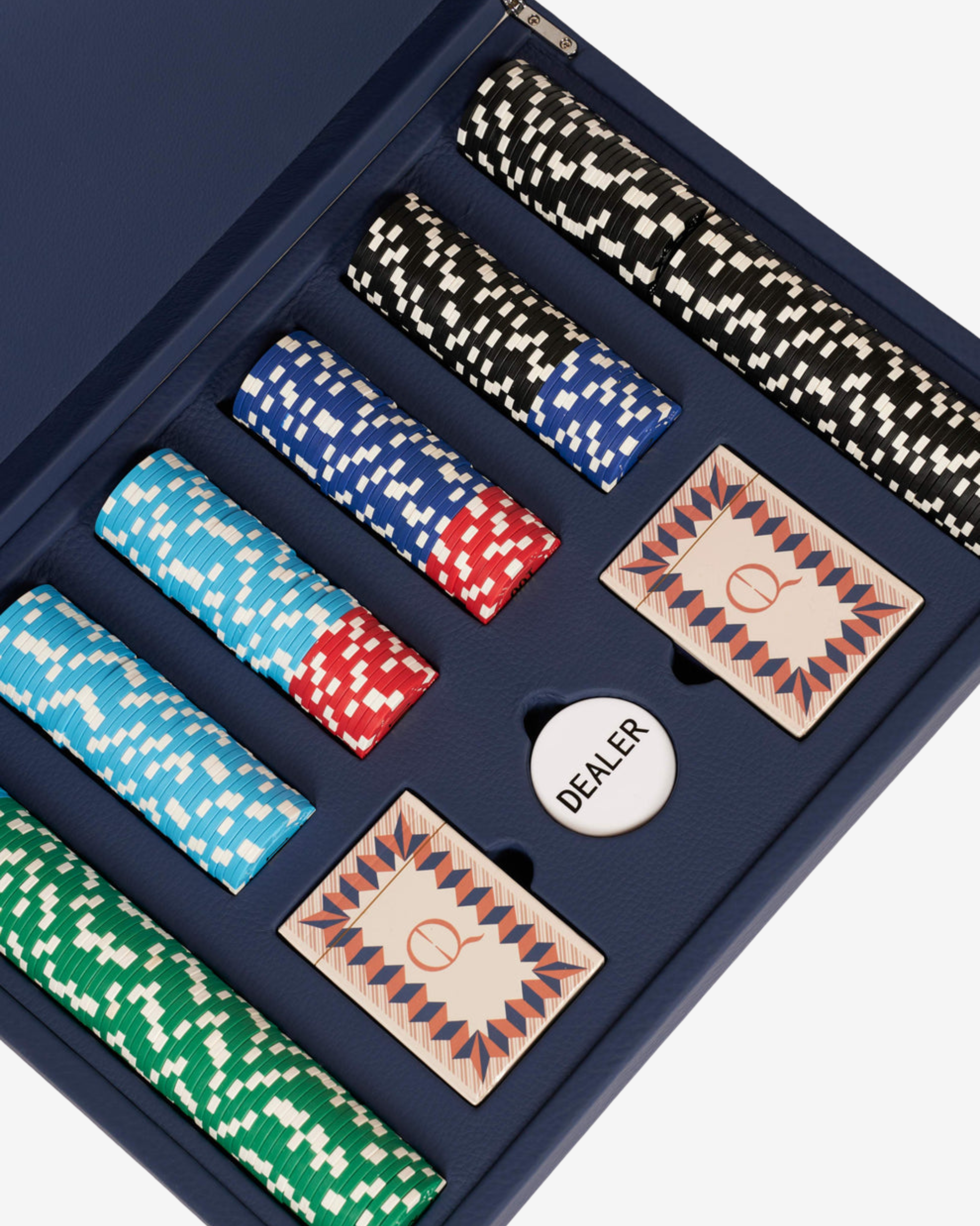 Meticulously handcrafted from genuine leather, this luxury leather poker set blends sophistication with durability. The set includes two decks of high-quality playing cards, 300 poker chips, and dealer, big blind, and small blind chips—everything needed for a professional-grade gaming experience. Compact and travel-ready, it’s designed for both home games and on-the-go entertainment. A standout gift for poker lovers.