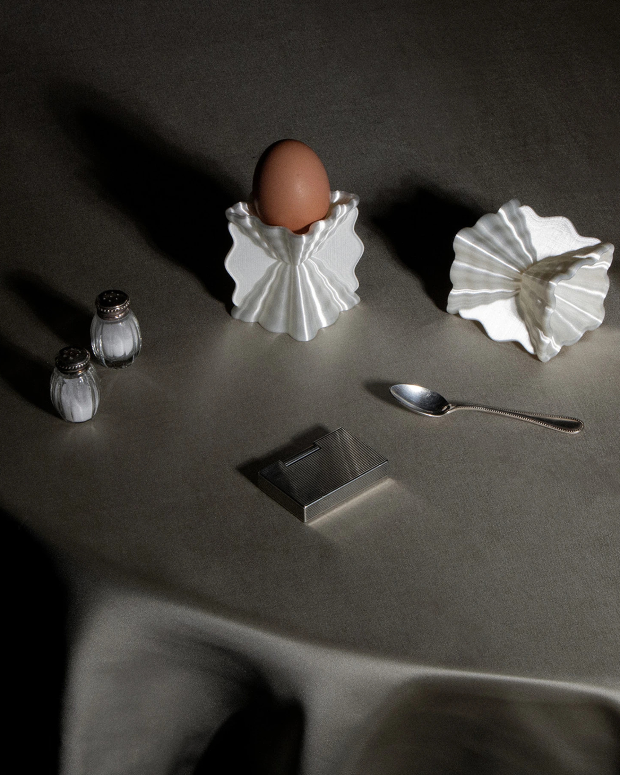 This eggcup pays homage to the classic shapes of Greco-Roman cups, associated with the wavy imprints that the sea leaves on the sand as it recedes. Its pearlescent appearance captures and reflects light, giving it a subtle and elegant presence. Each piece is made in France, printed with biosourced material. Due to the 3D printing process, variations in texture and color may occur.