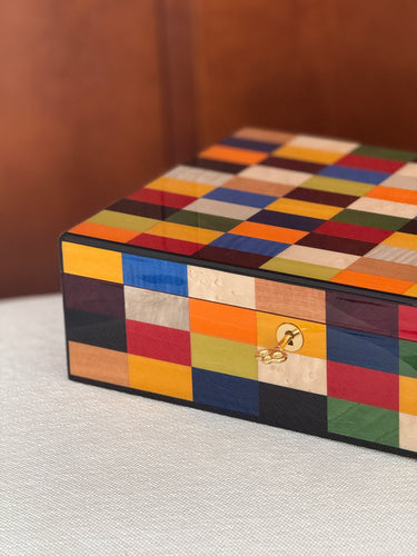 Handcrafted in Italy, this Wood Inlay Jewellery Box pairs vibrant geometric wood inlays with a high-gloss lacquered finish and plush Alcantara-lined compartments—complete with a gold-toned lock and key, it’s a timeless gift for marking milestones or treasuring personal keepsakes. Perfect match to the Morici Wood Inlay Desk Tray.