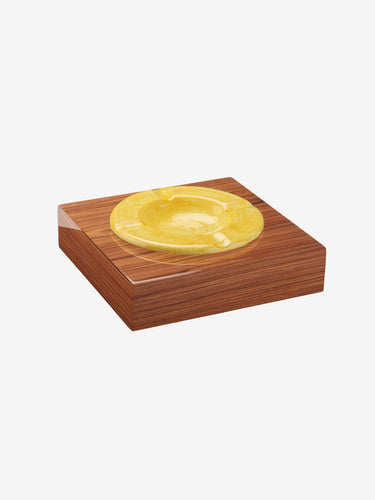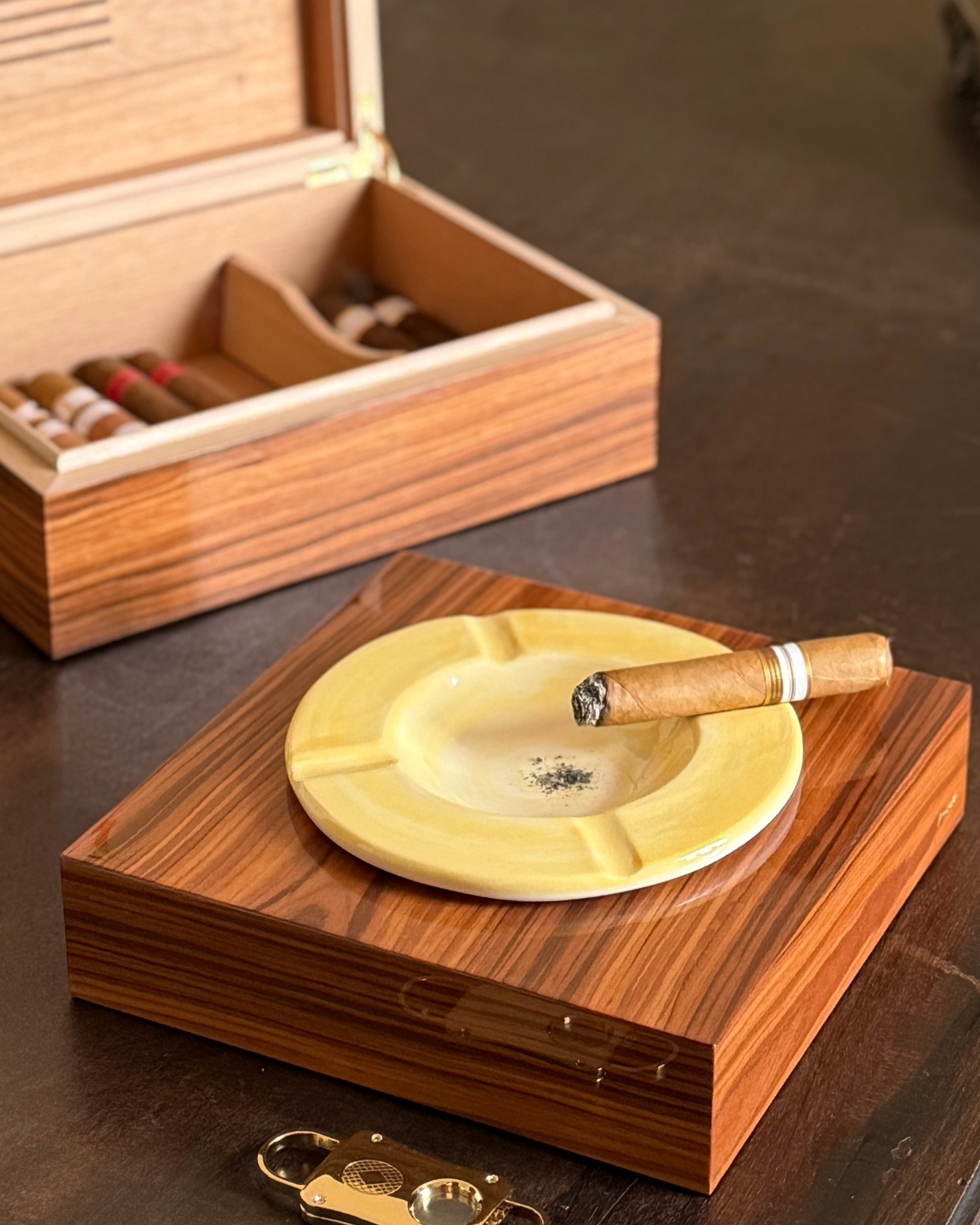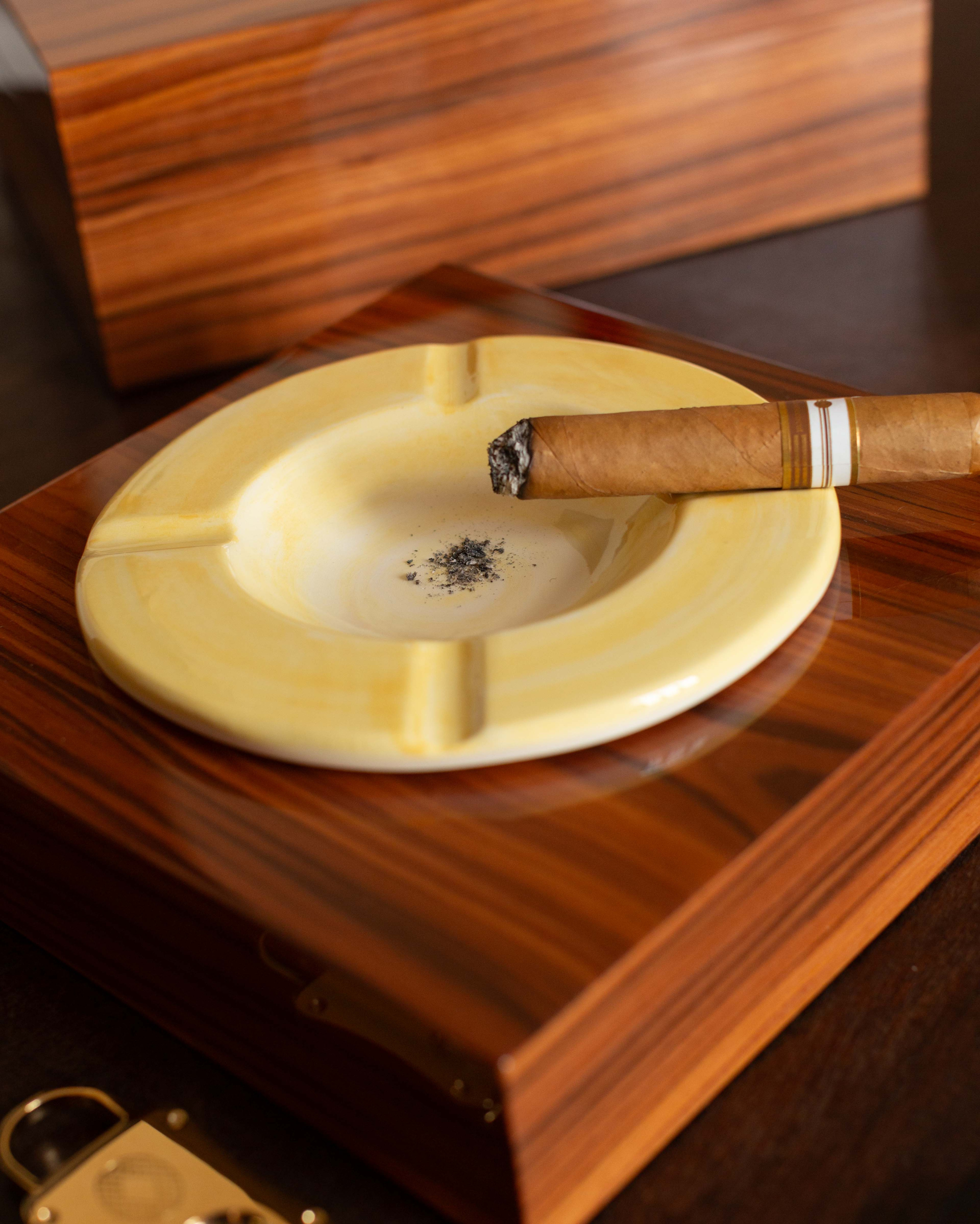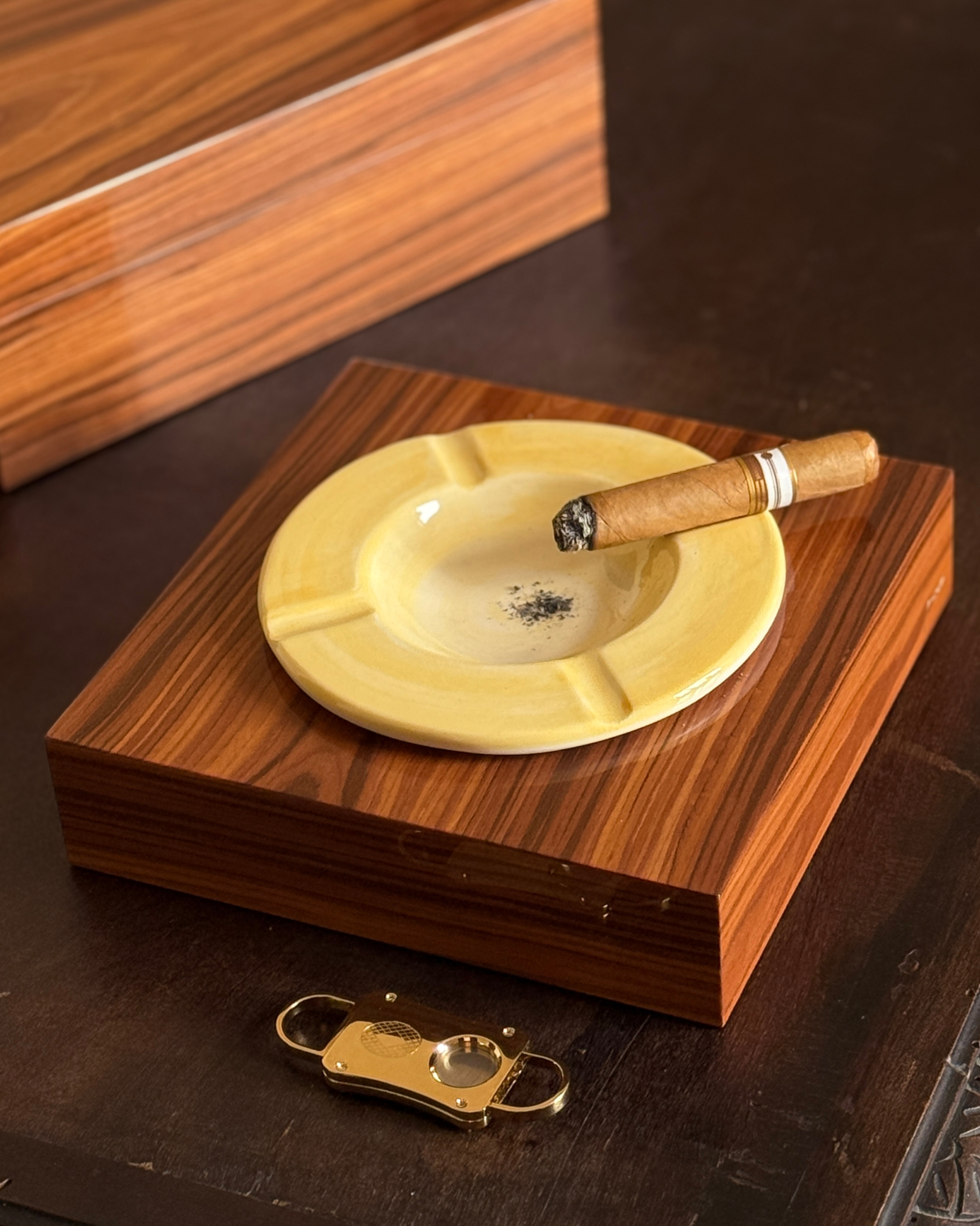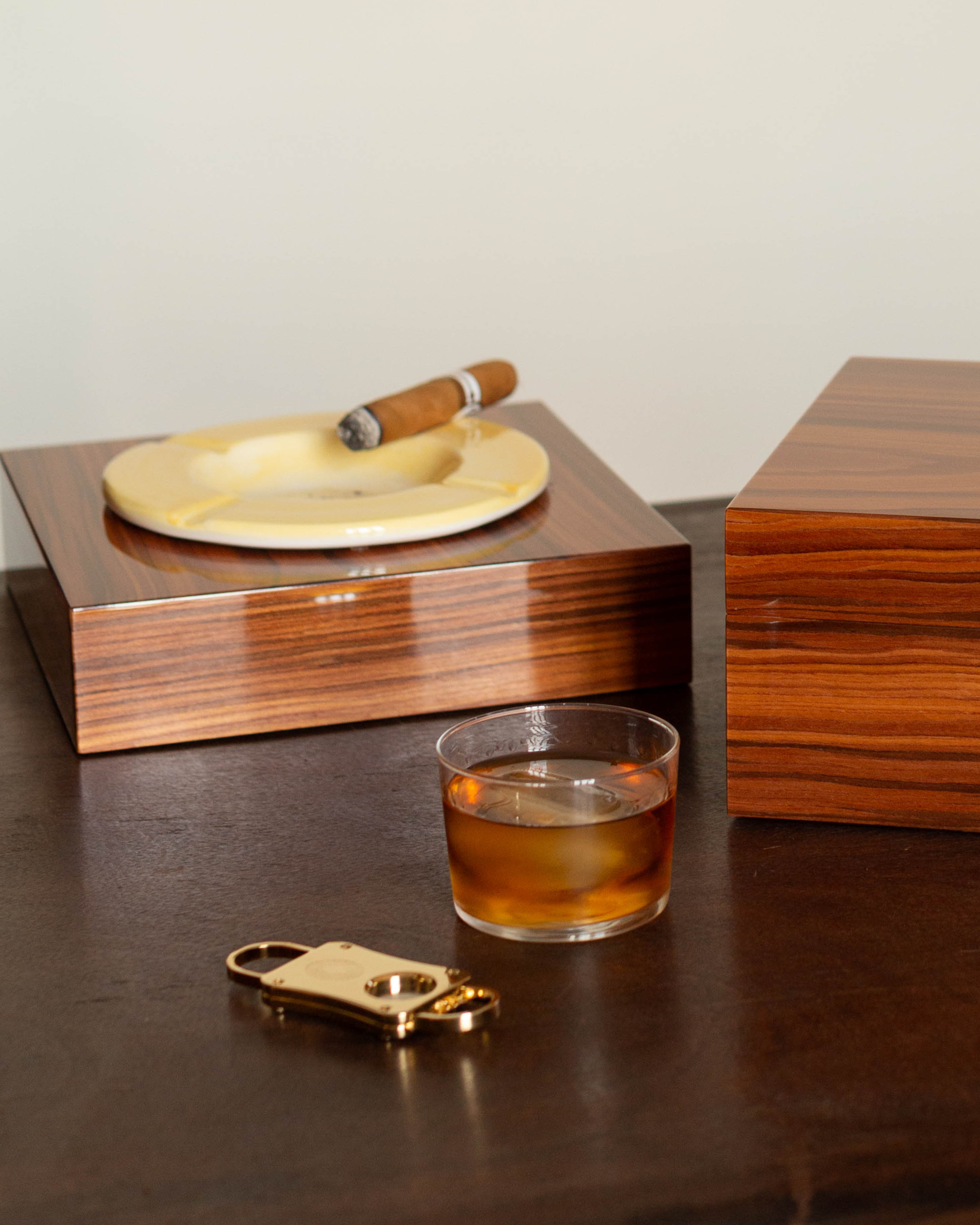 A tribute to the ritual of cigar smoking, the Roma Ashtray is handmade in Italy with a removable hand-glazed ceramic bowl and a high-gloss wood base—available in veined blue, veined green, or rosewood—each piece unique in its grain and finish, making it a refined and thoughtful gift for design lovers and modern cigar connoisseurs alike.