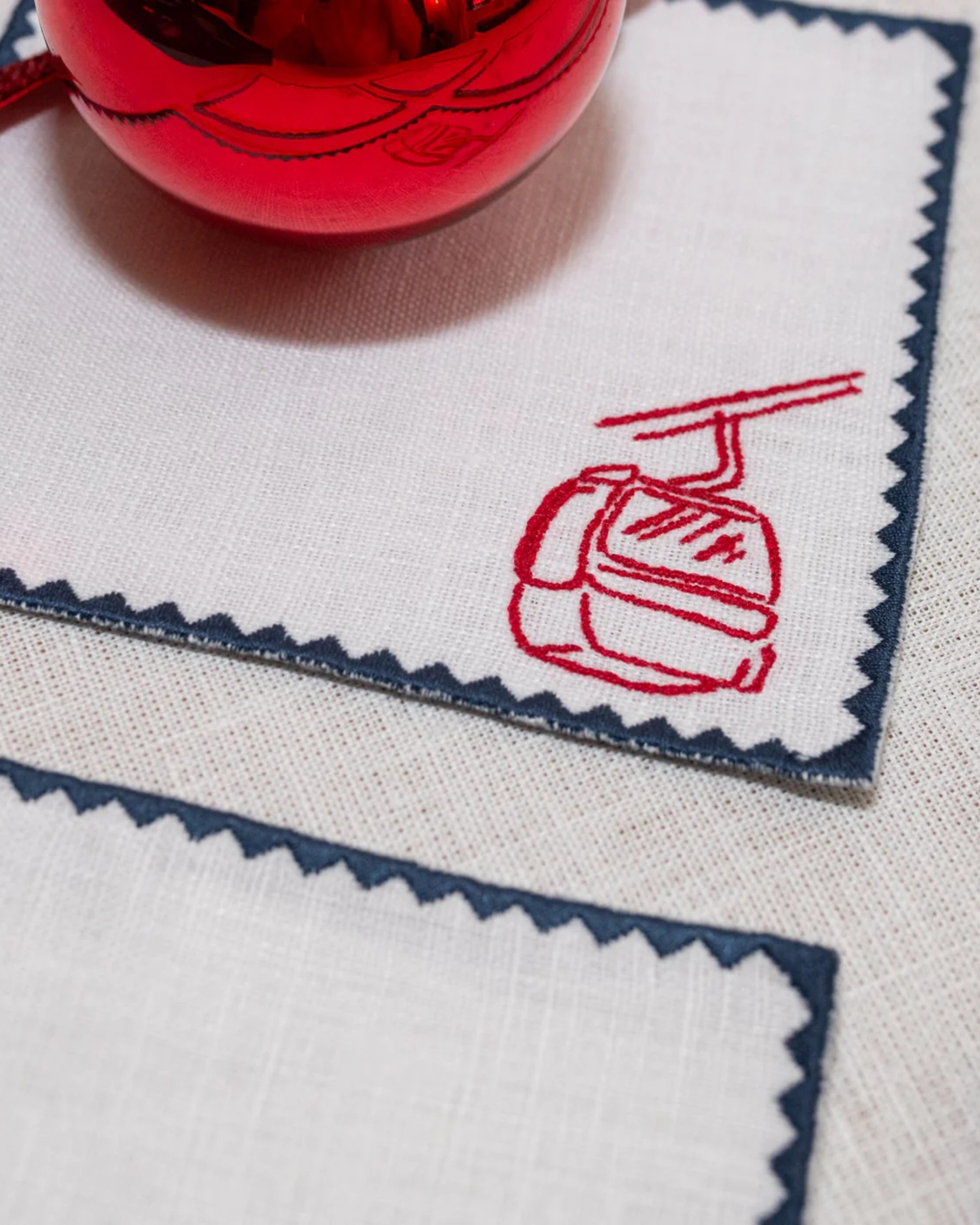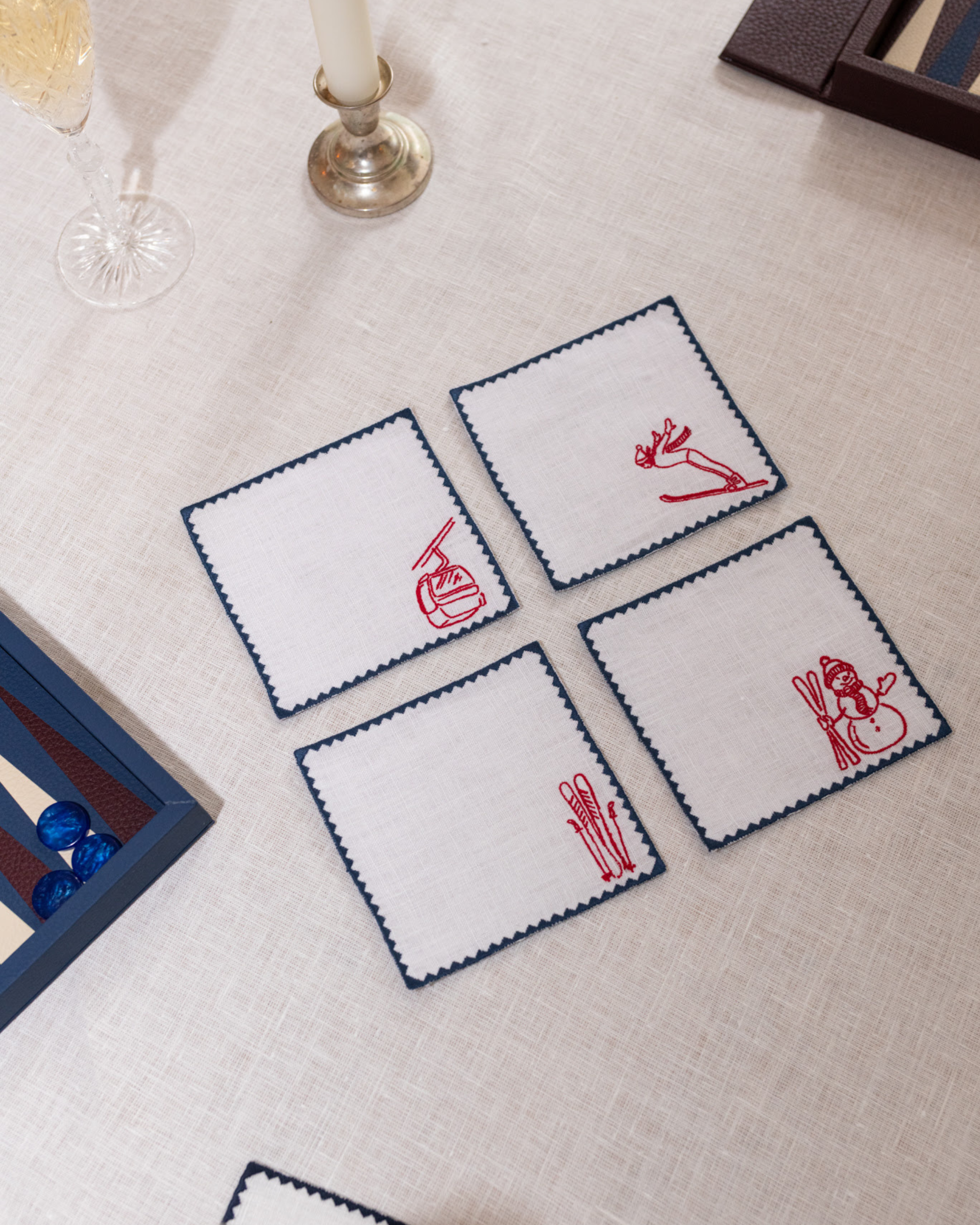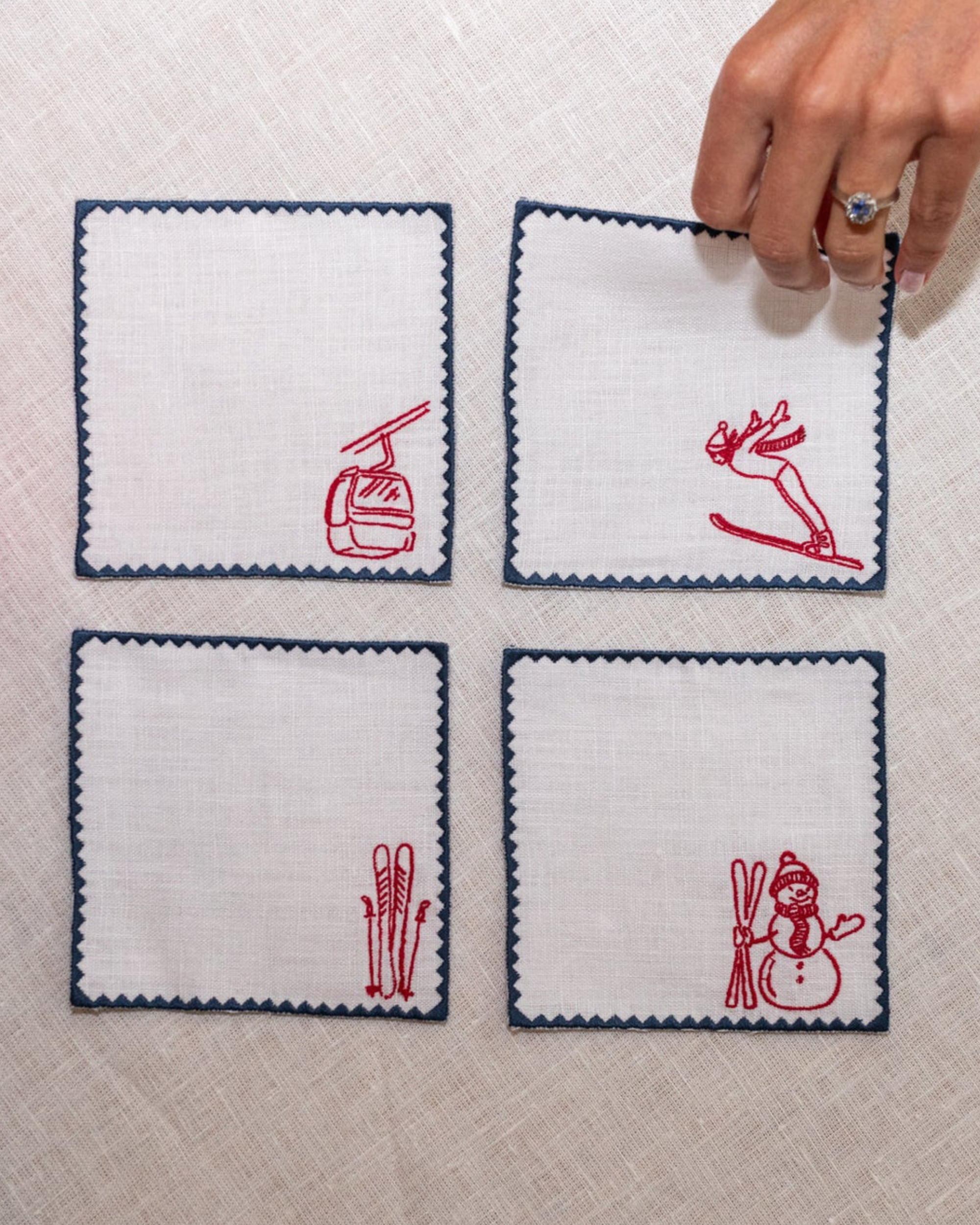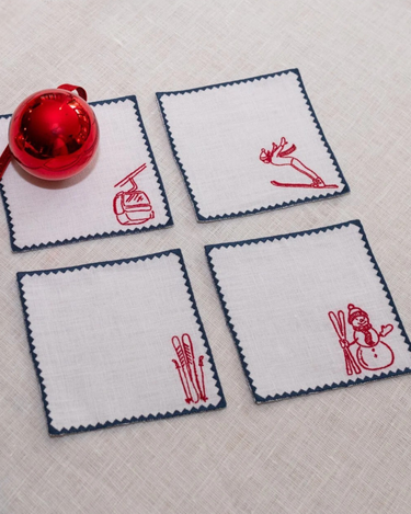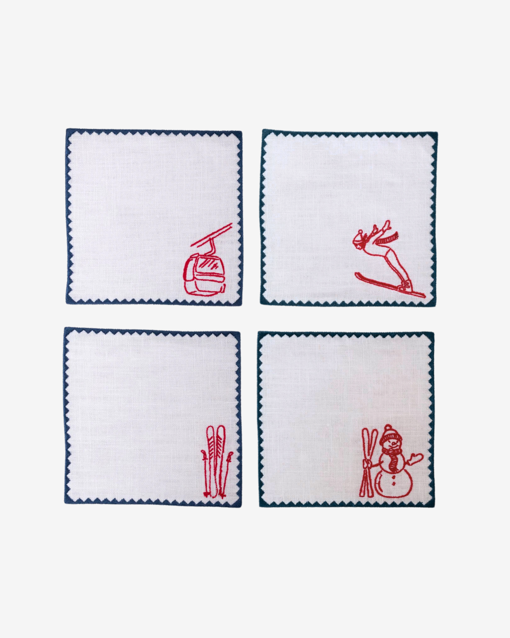 Whether for après-ski cocktails, mountain getaways, or fireside drinks at home, this set adds a spirited seasonal touch to the table — a perfect gift for winter hosts and snow lovers. Each linen napkin is embroidered with a unique ski-inspired motif in bright red and framed with a midnight blue edge.