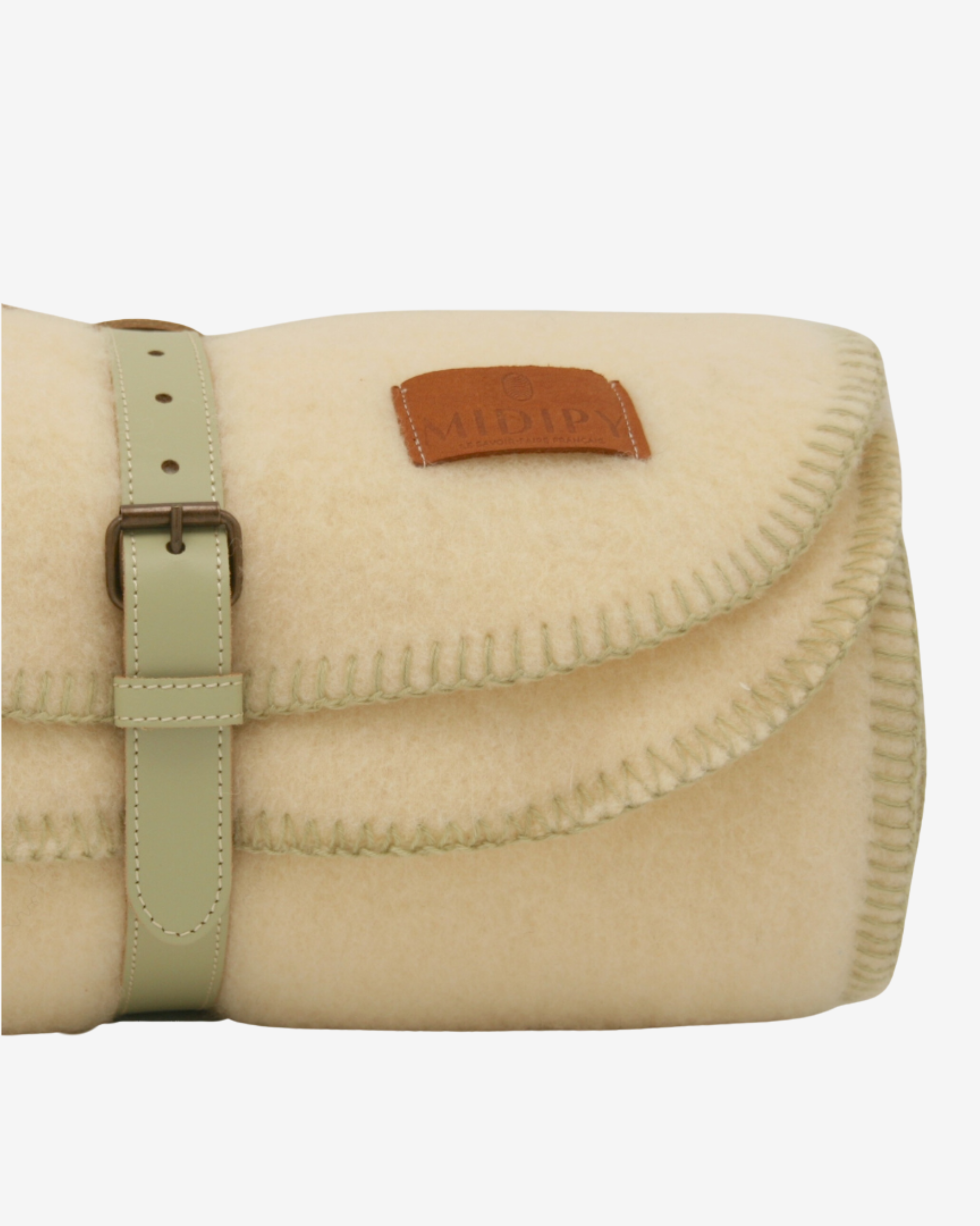 Ivory Wool Throw with Leather Holder – Green Stitch