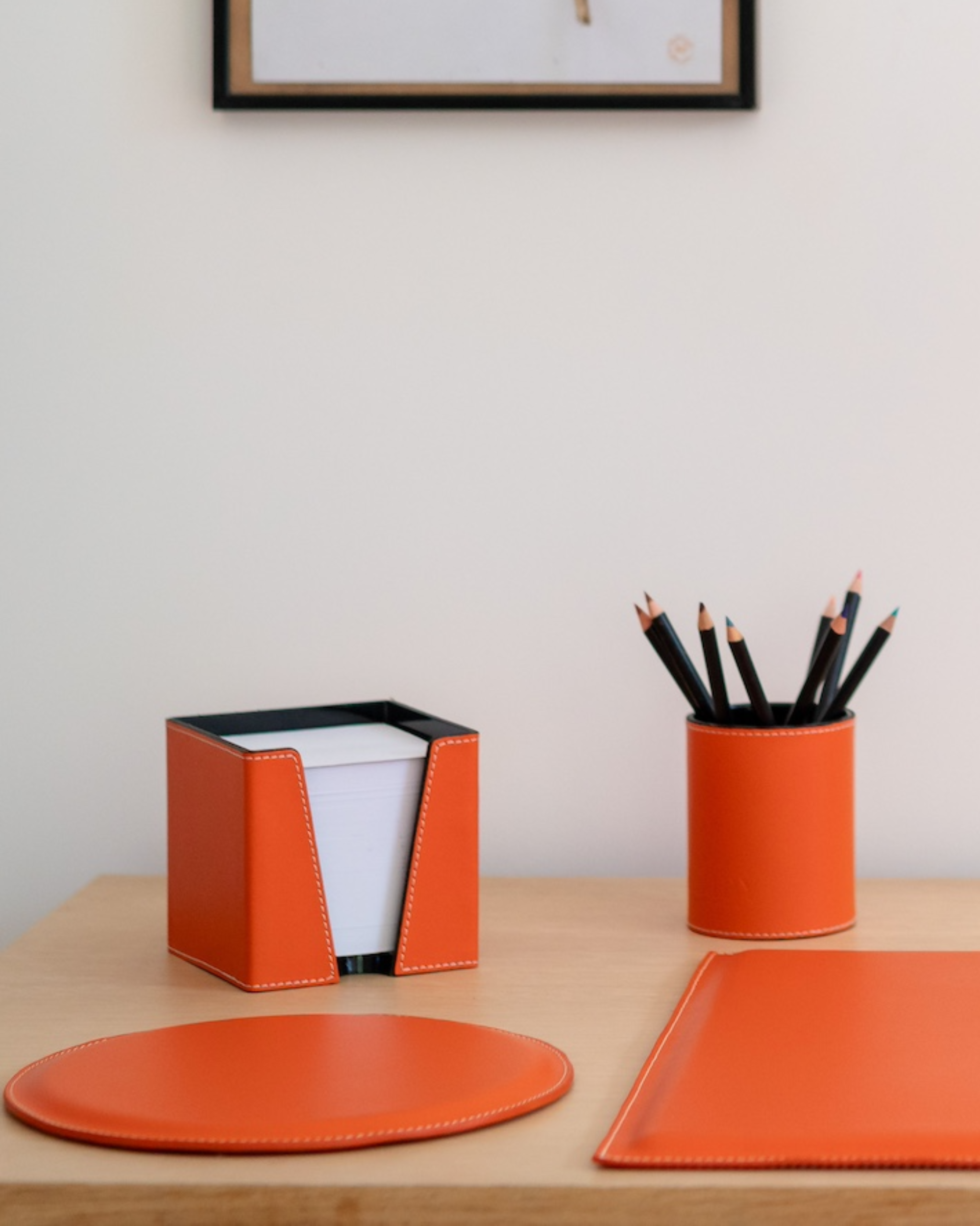 Designed to pair with the matching leather desk pad, pencil holder, and wastepaper bin.