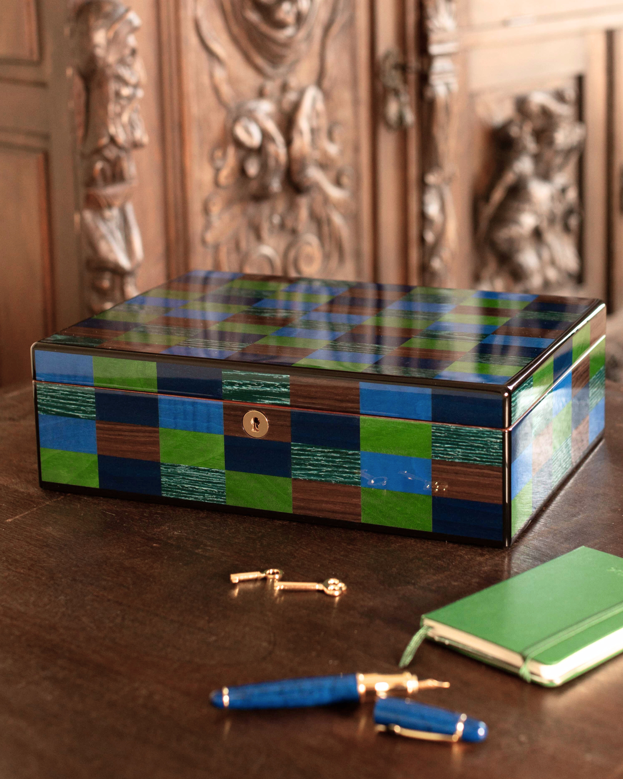 A bold take on traditional marquetry, this Wood Inlay Cigar Humidor features a vibrant inlaid wood mosaic, gold-toned lock and key, cedar wood interior, and built-in digital hygrometer—an elegant, functional gift for collectors who appreciate Italian design and cigar rituals alike.