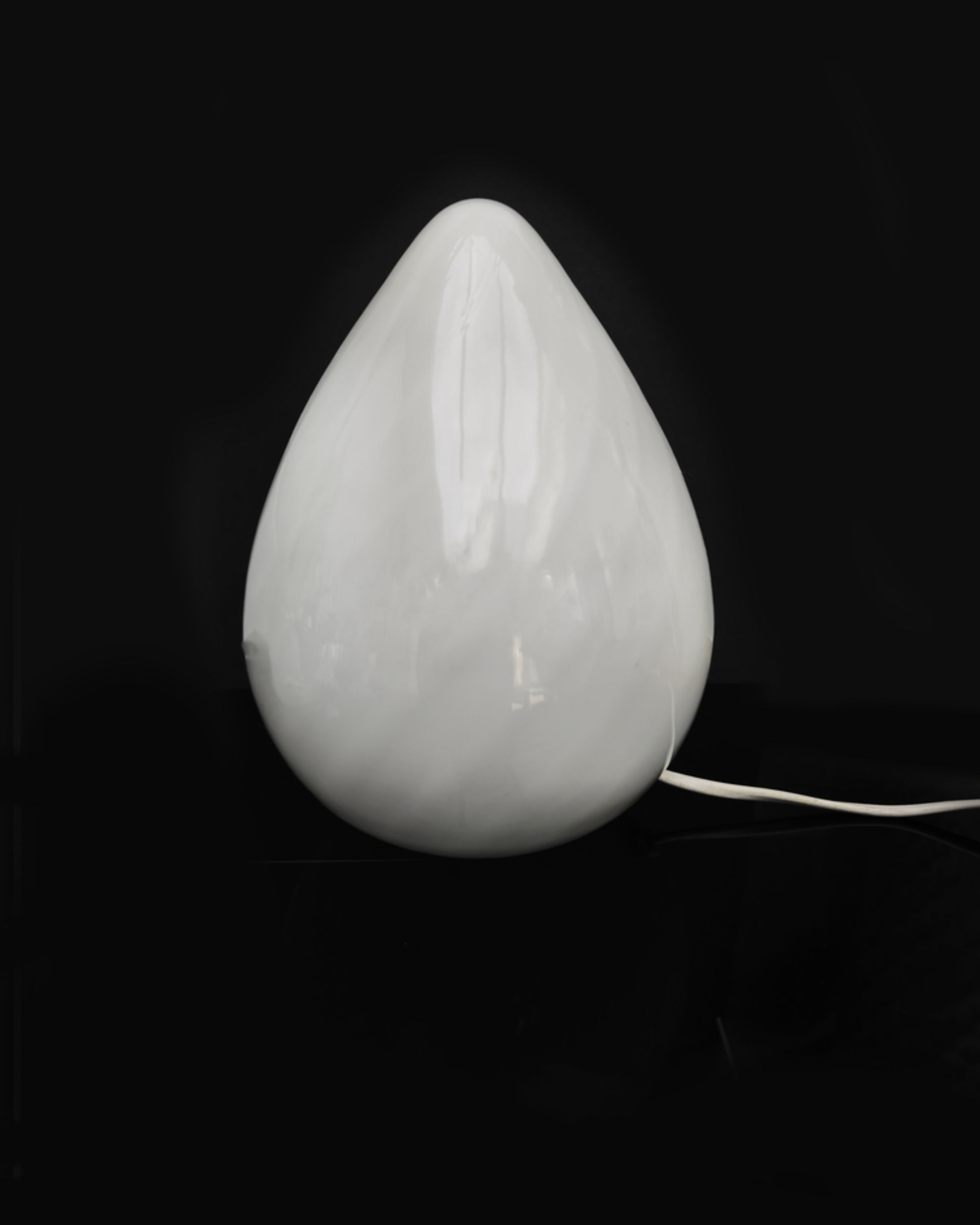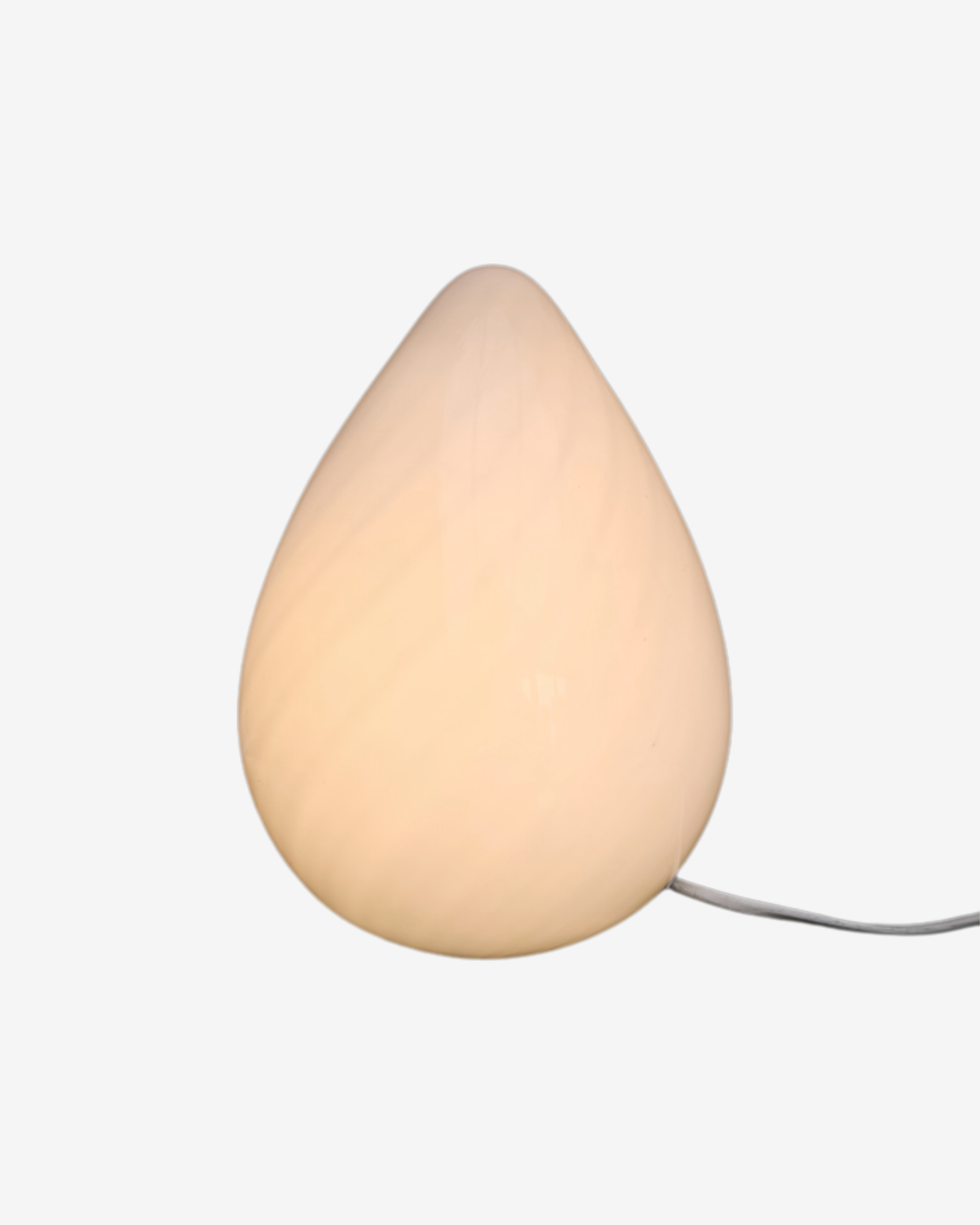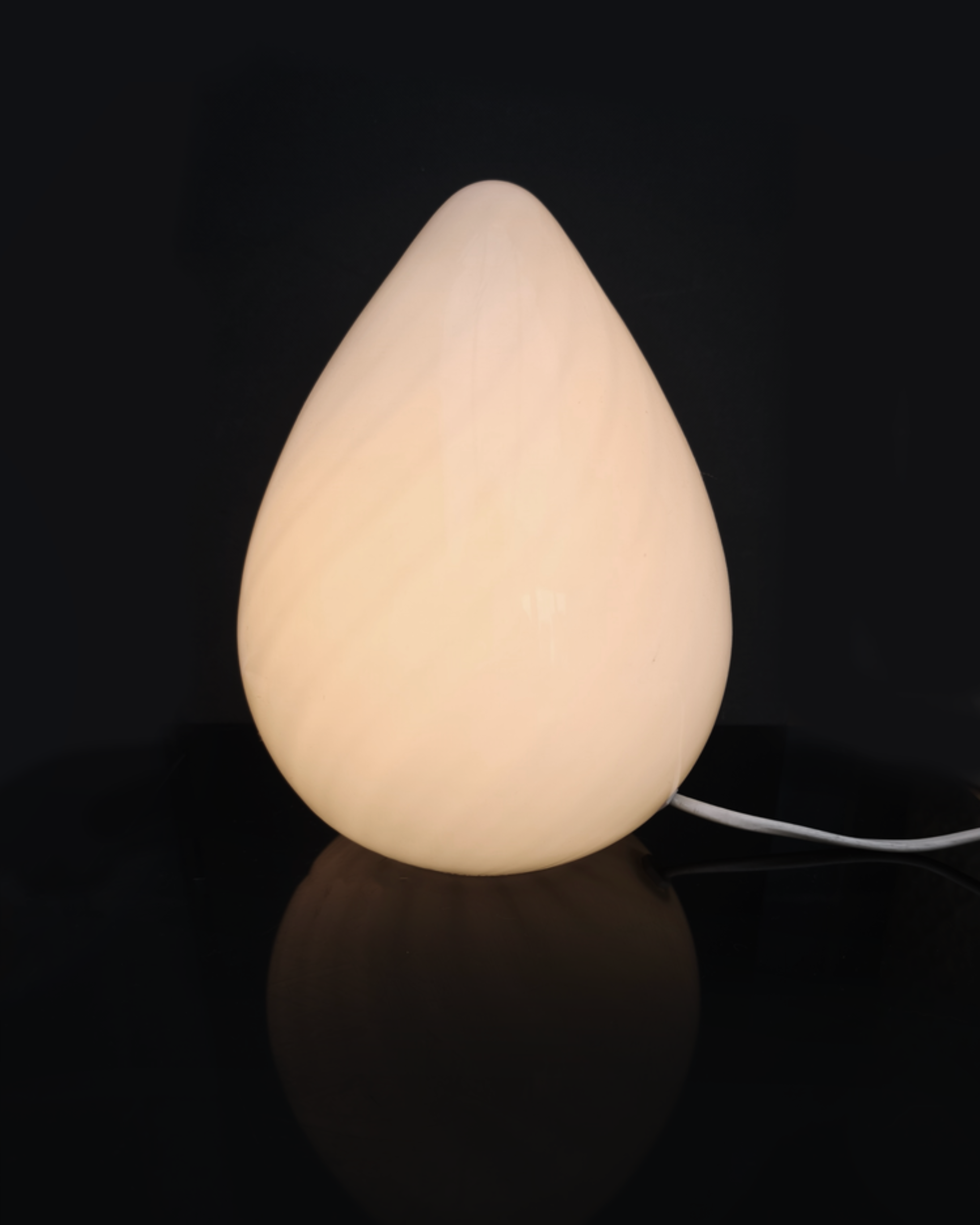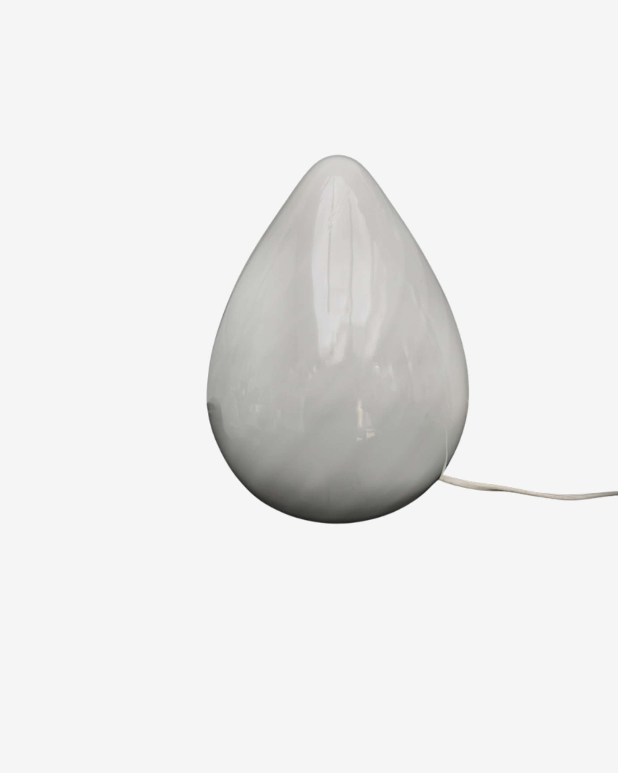 A vintage hand-blown Murano glass lamp in a rare egg-shaped form. Its soft white swirl pattern glows with gentle luminosity, casting a warm, diffused light that feels both sculptural and serene. A timeless piece of Italian glass artistry — understated yet deeply expressive.