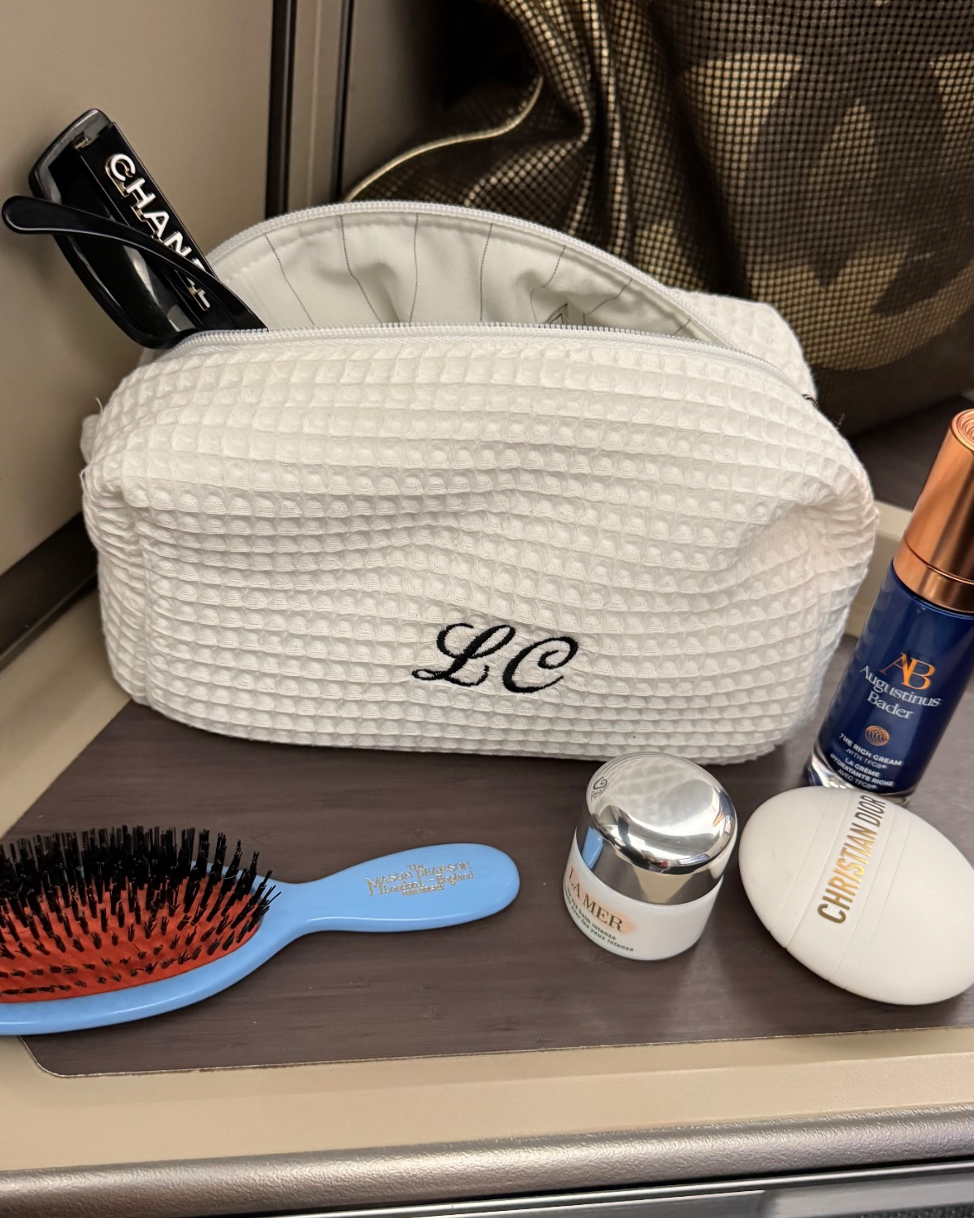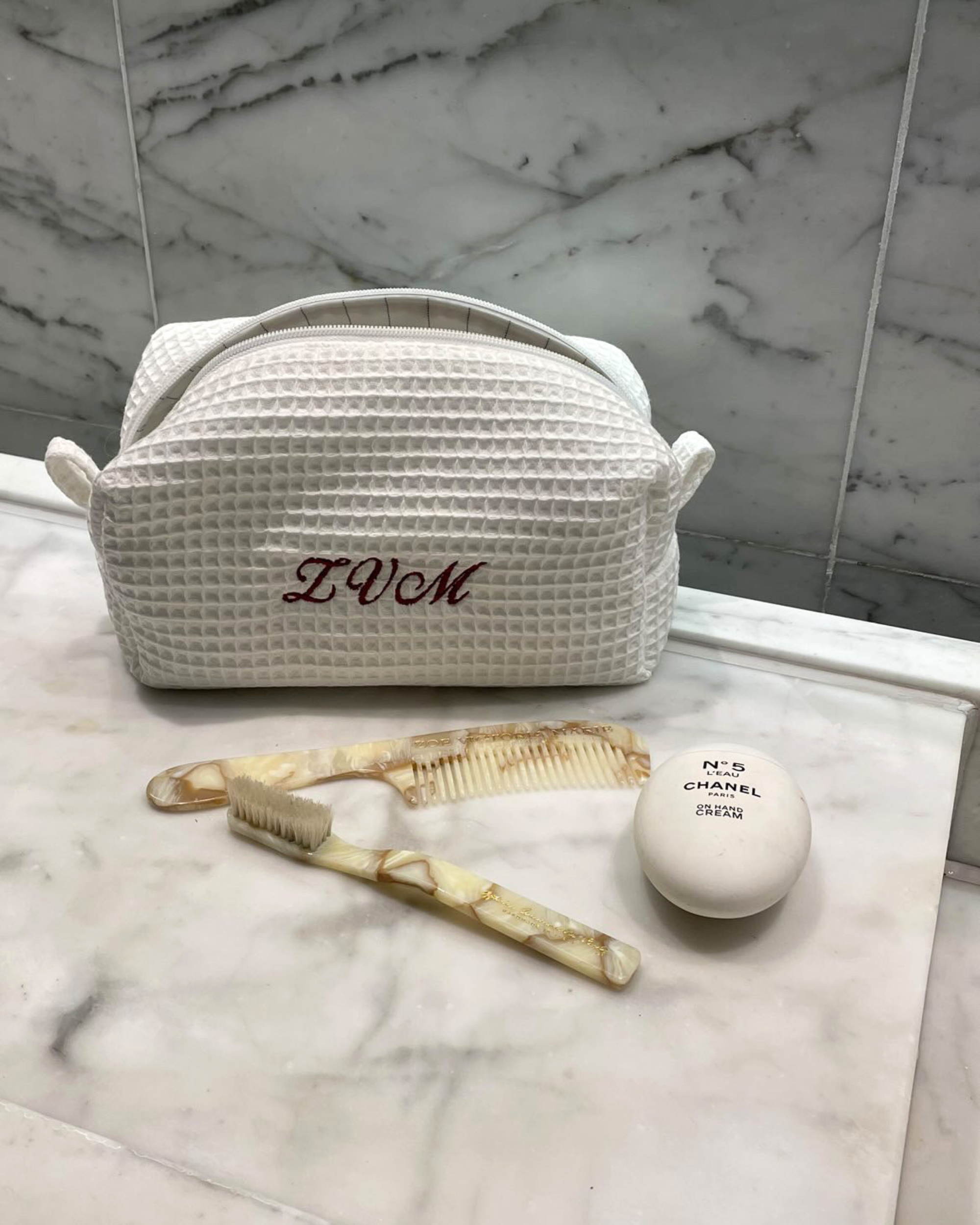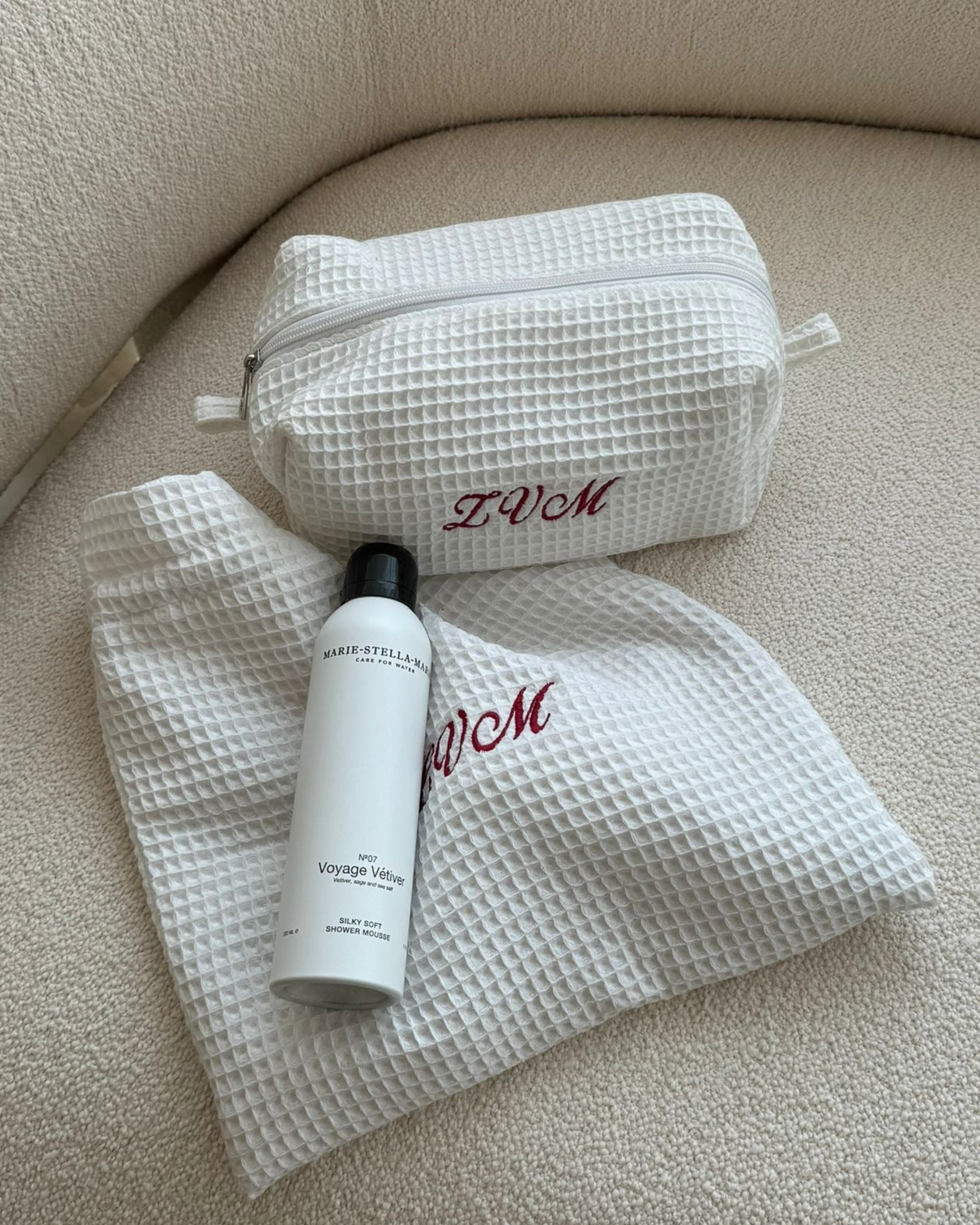 Handcrafted in Spain from 100% cotton waffle fabric, the Powder White Custom Toiletry Bag is lined with a stain-resistant poplin interior and finished with a nylon zipper and silver-toned closure. Lightweight yet durable, it’s designed to withstand daily use while keeping your essentials organised in style. Personalise it with your initials for a piece that’s uniquely yours.