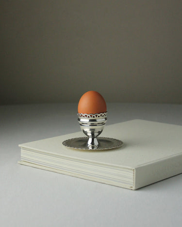 Crafted from high-quality alpaca and finished with a delicately ornate rim, this vintage egg holder brings understated luxury to the breakfast table. Its graceful design and soft patina make it a timeless accent, perfect for special occasions or adding sophistication to your morning ritual.