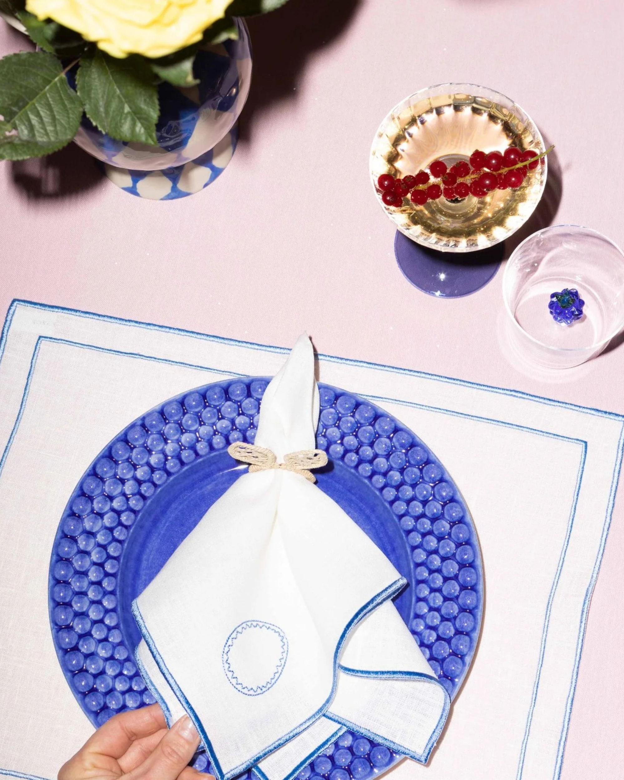 Crisp white linen, framed with delicate light blue embroidery, gives these placemats a timeless Mediterranean character. Their rectangular form provides an elegant base for layering plates and glassware, immediately elevating the table with an airy charm.