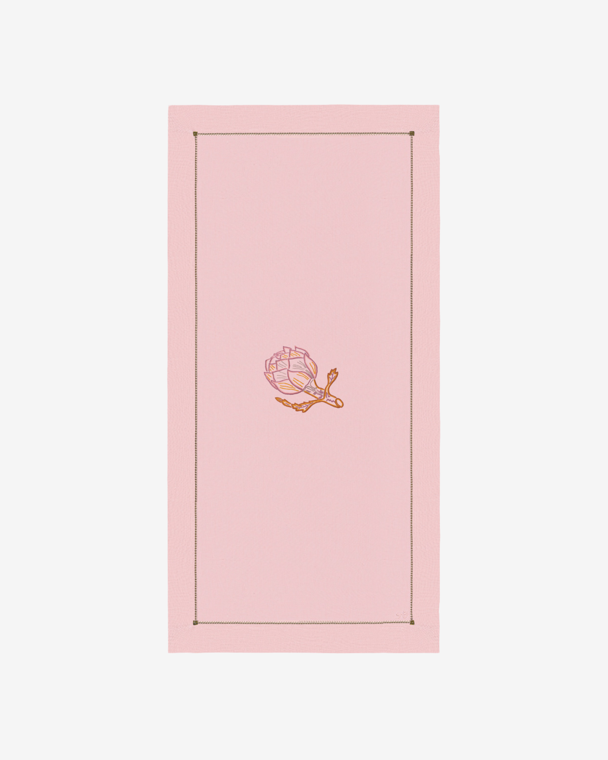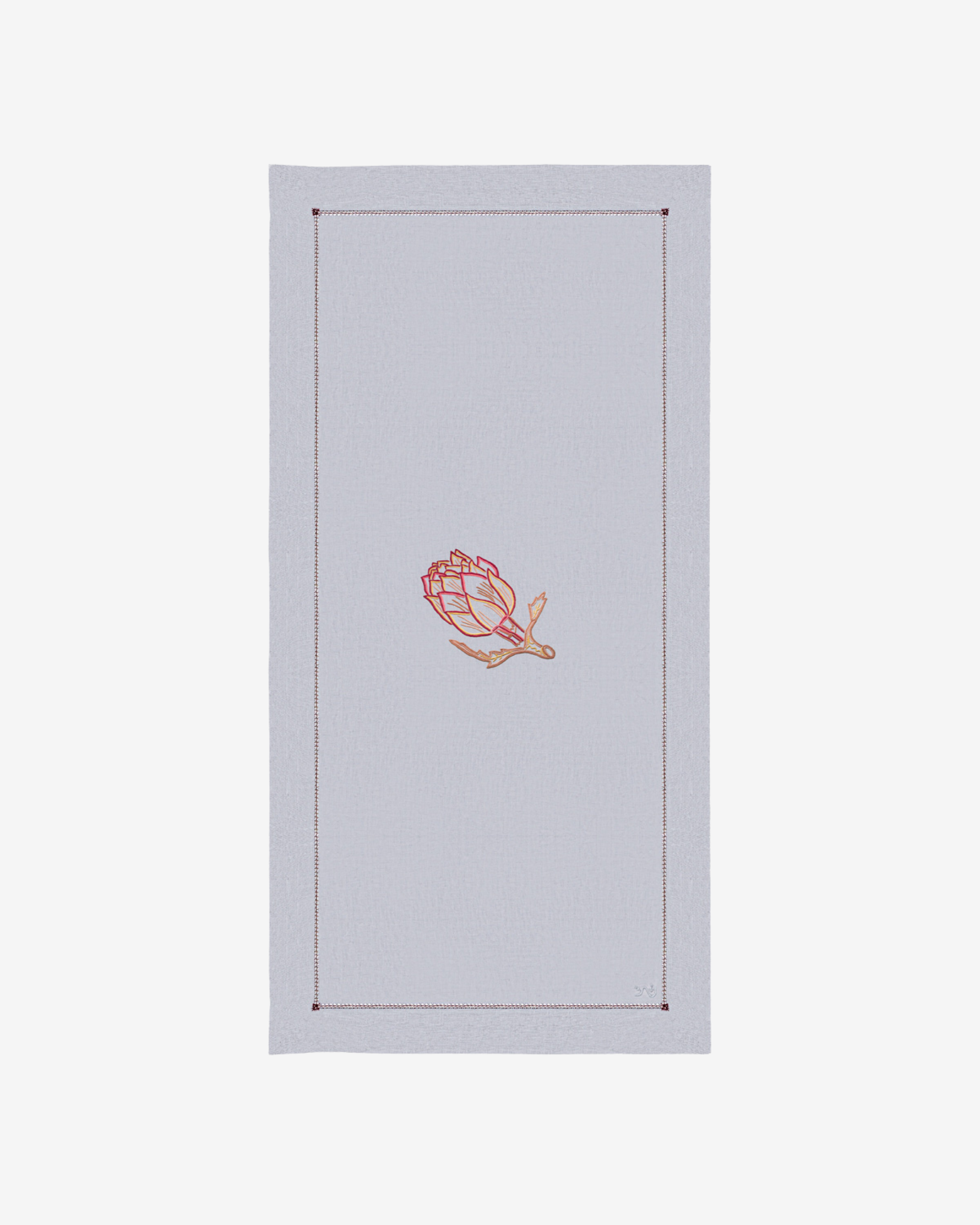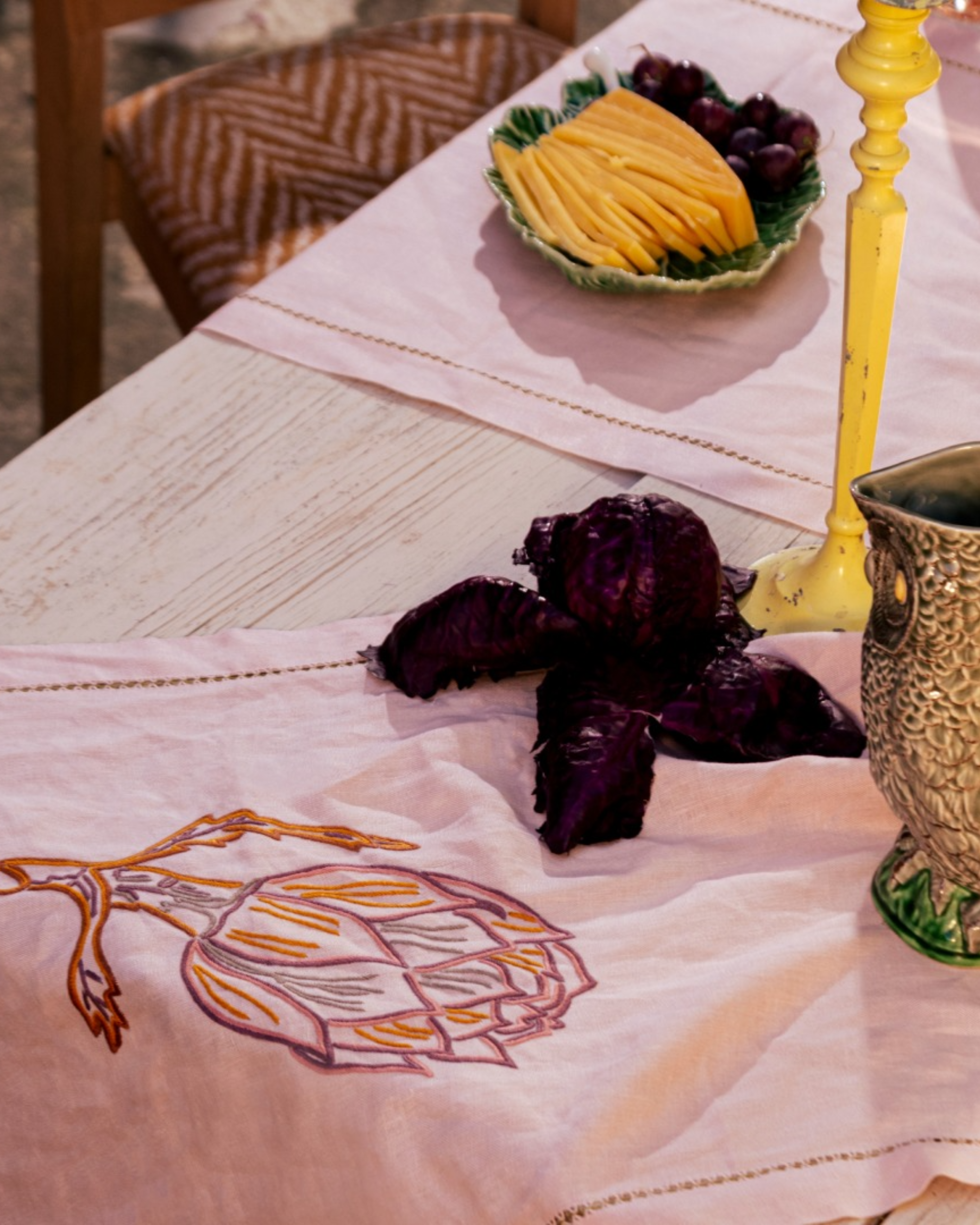 Celebrating the artichoke’s elegant silhouette, this embroidered linen table runner brings sculptural charm and quiet sophistication to any dining table. Each motif is hand-embroidered by Portuguese artisans, taking over fourteen hours to complete, while the open-hem finish adds a subtle decorative touch. Whether used alone or paired with other pieces from the Alcachofra collection, it creates a harmonious and timeless setting for gatherings.