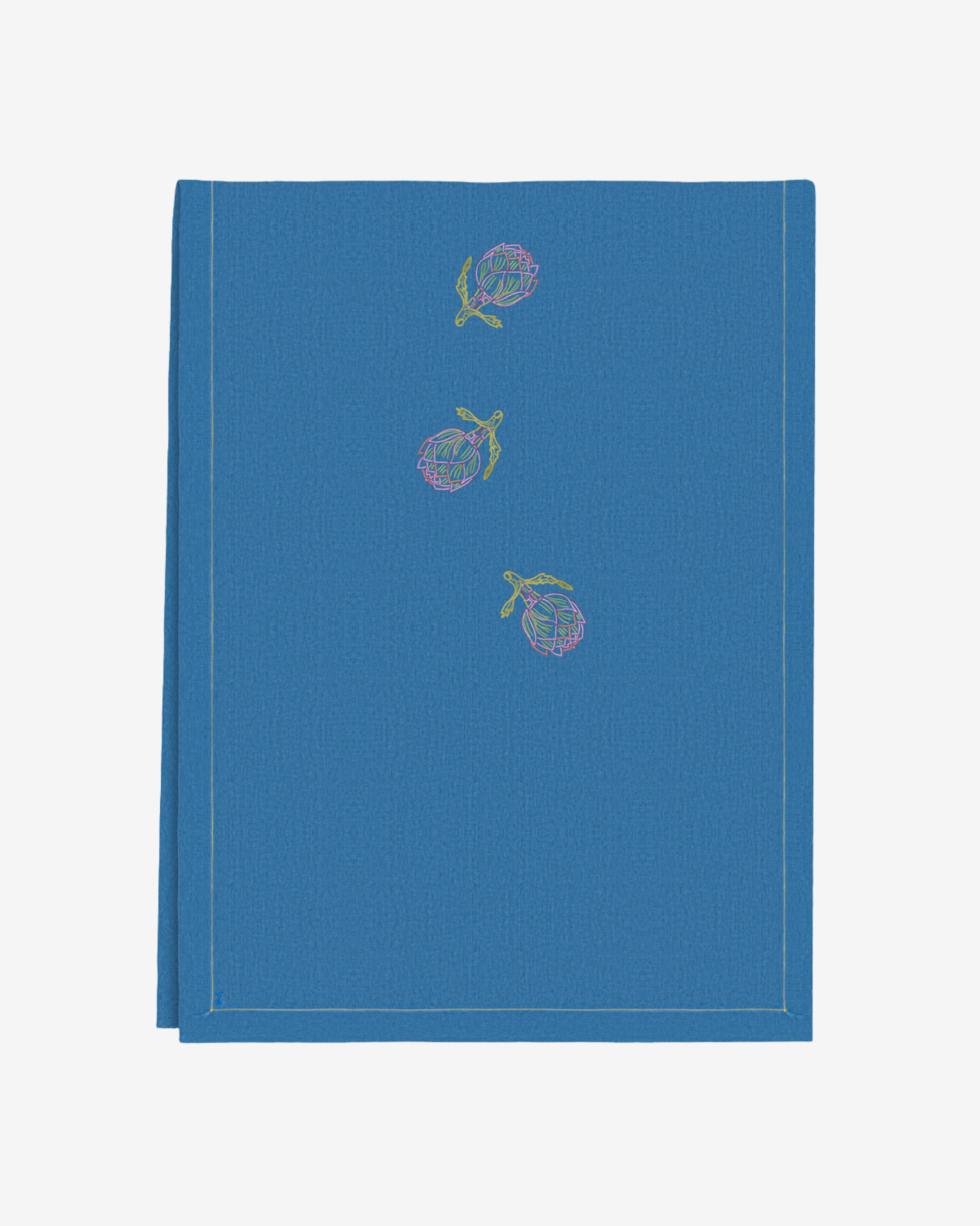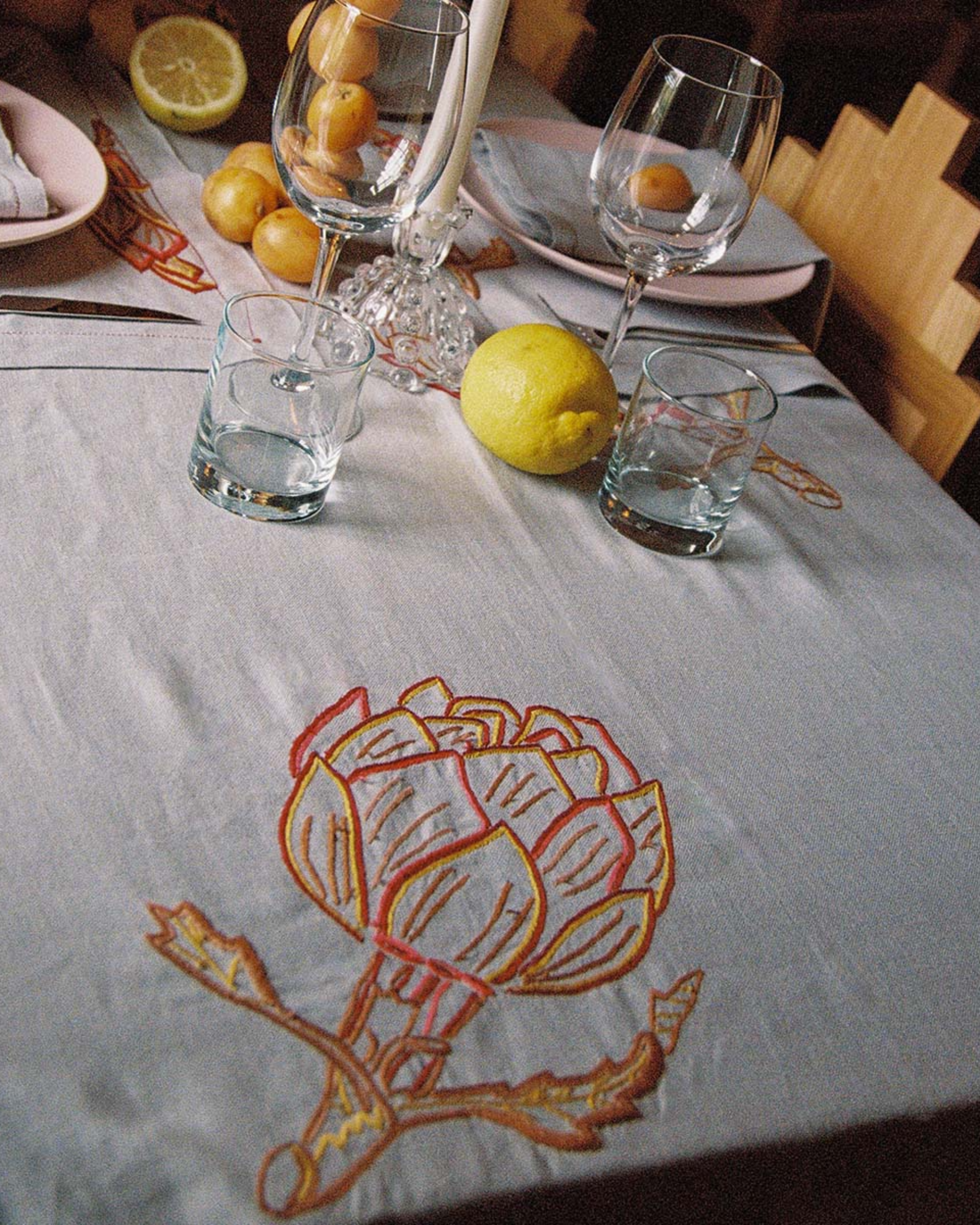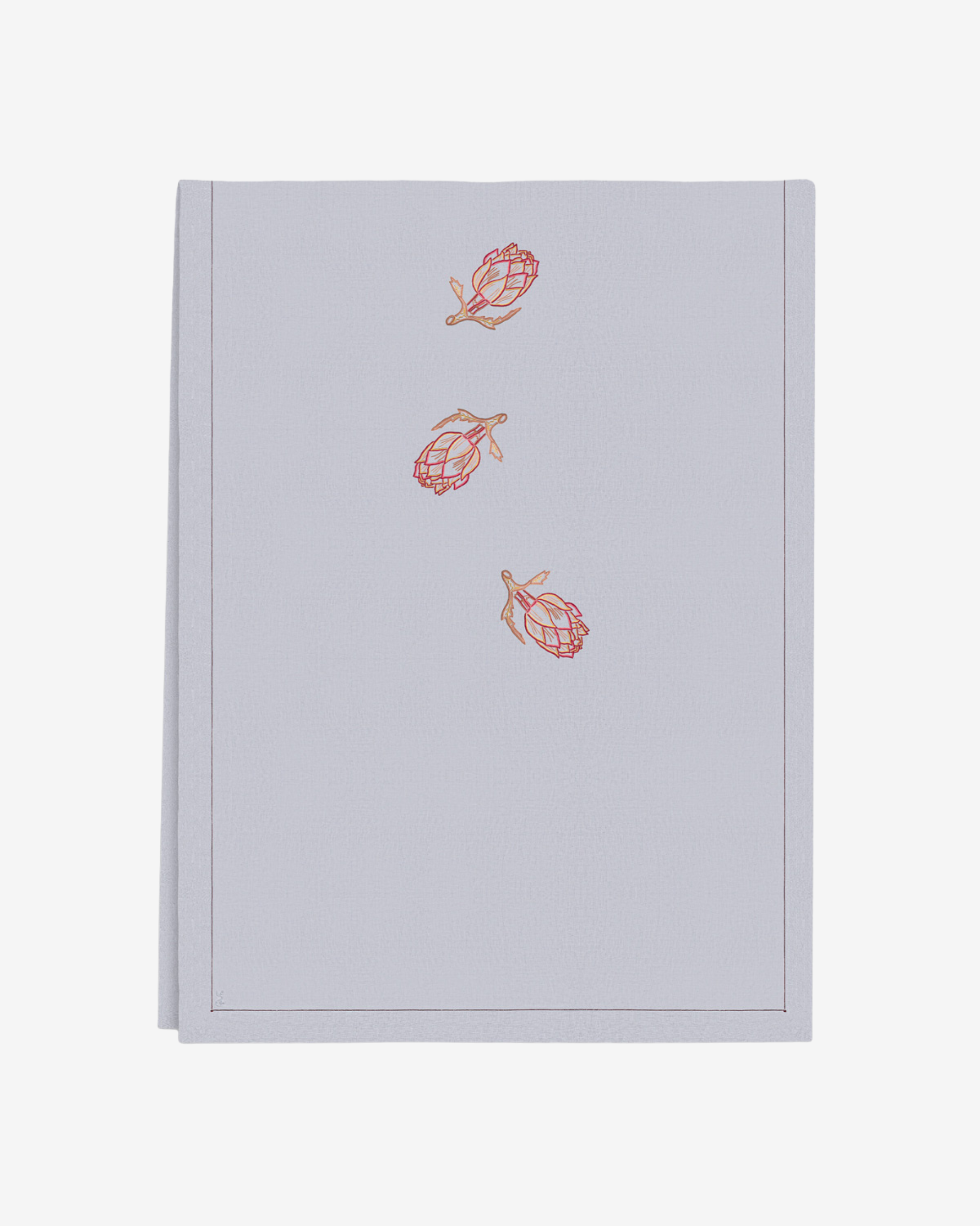 Embodying the sculptural elegance of the artichoke, this embroidered linen tablecloth makes a striking centrepiece for long, convivial gatherings. Each motif is hand-embroidered by Portuguese artisans, requiring over fourteen hours of meticulous work, and bordered by refined open hems that enhance its artisanal charm. Its generous proportions offer a timeless foundation for memorable celebrations. Pair with other pieces from the Alcachofra collection to complete the setting.