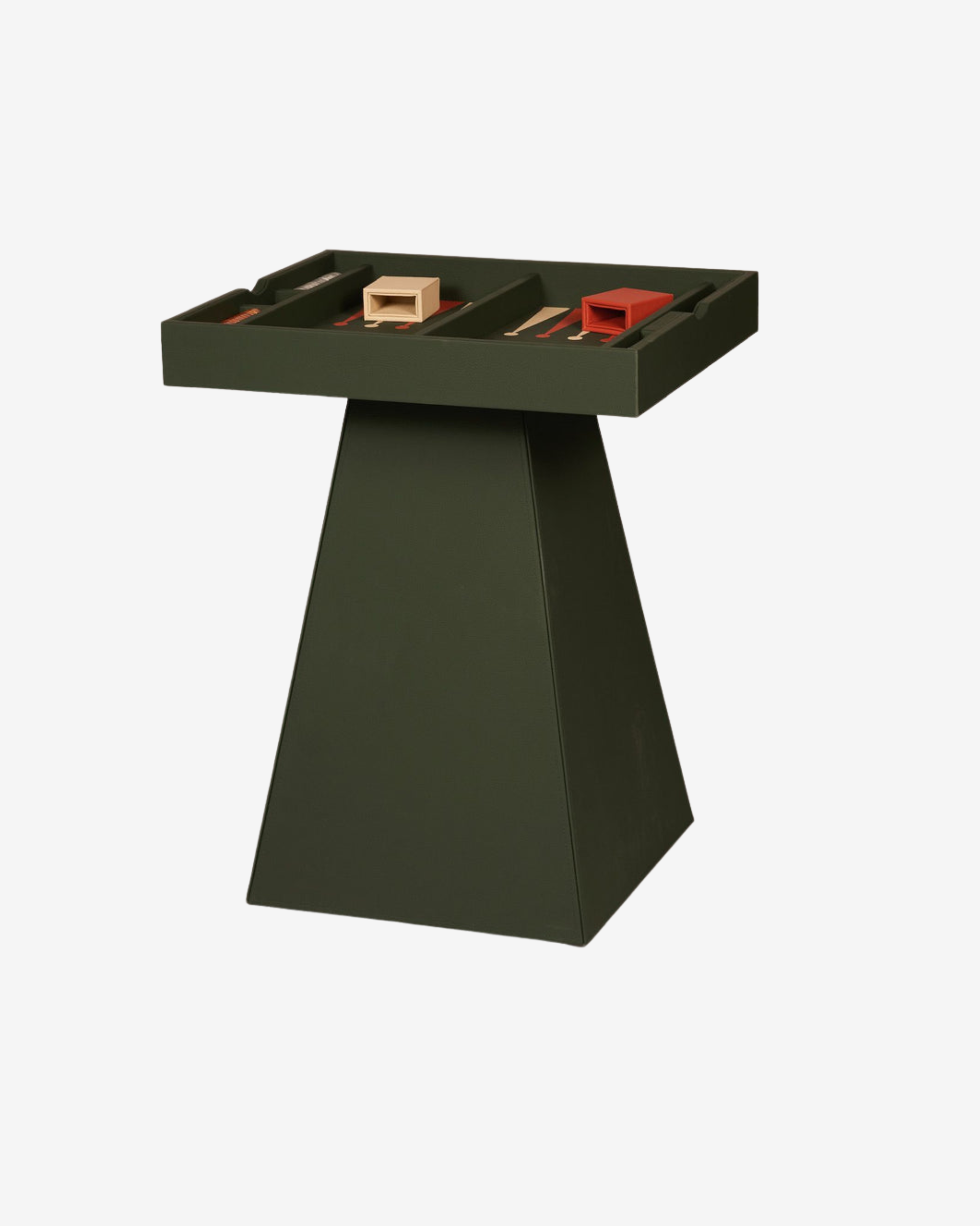 At first glance, it reads like modern sculpture: a bold, leather-wrapped pedestal, sharply faceted and precisely proportioned. Its presence is immediate—clean lines, saturated color, and architectural poise. Whether finished in deep olive green, orange, or blue this piece balances form and function effortlessly.