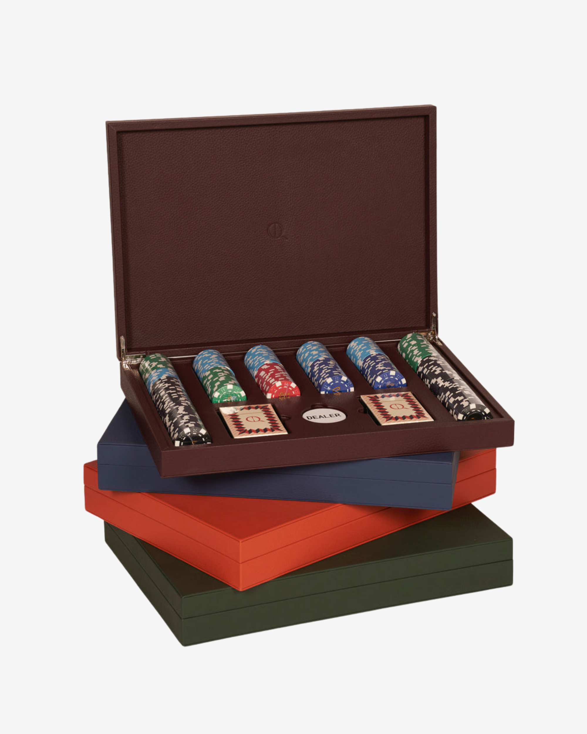 Meticulously handcrafted from genuine leather, this luxury leather poker set blends sophistication with durability. The set includes two decks of high-quality playing cards, 300 poker chips, and dealer, big blind, and small blind chips—everything needed for a professional-grade gaming experience. Compact and travel-ready, it’s designed for both home games and on-the-go entertainment. A standout gift for poker lovers.