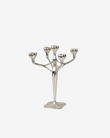 Elegant modernist-style candelabrum, designed with five arms that offer a harmonious and sophisticated arrangement to illuminate any space. Made of alpaca, it combines durability, shine, and a refined finish that adds a touch of distinction to both contemporary interiors and classic settings. Each holder has a diameter of 2 cm, ideal for standard candles. Perfect as a centerpiece on dining tables, living rooms, or special events.