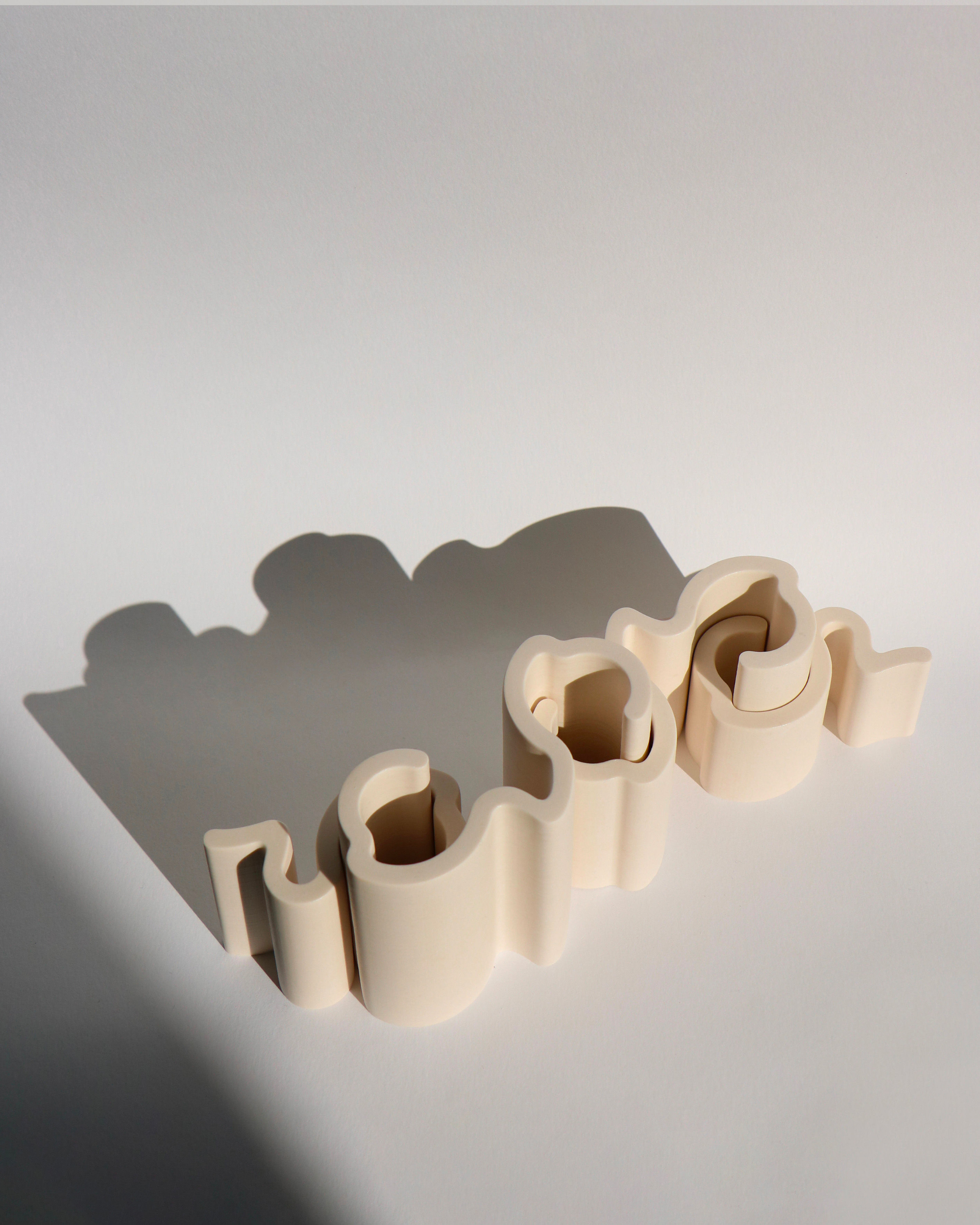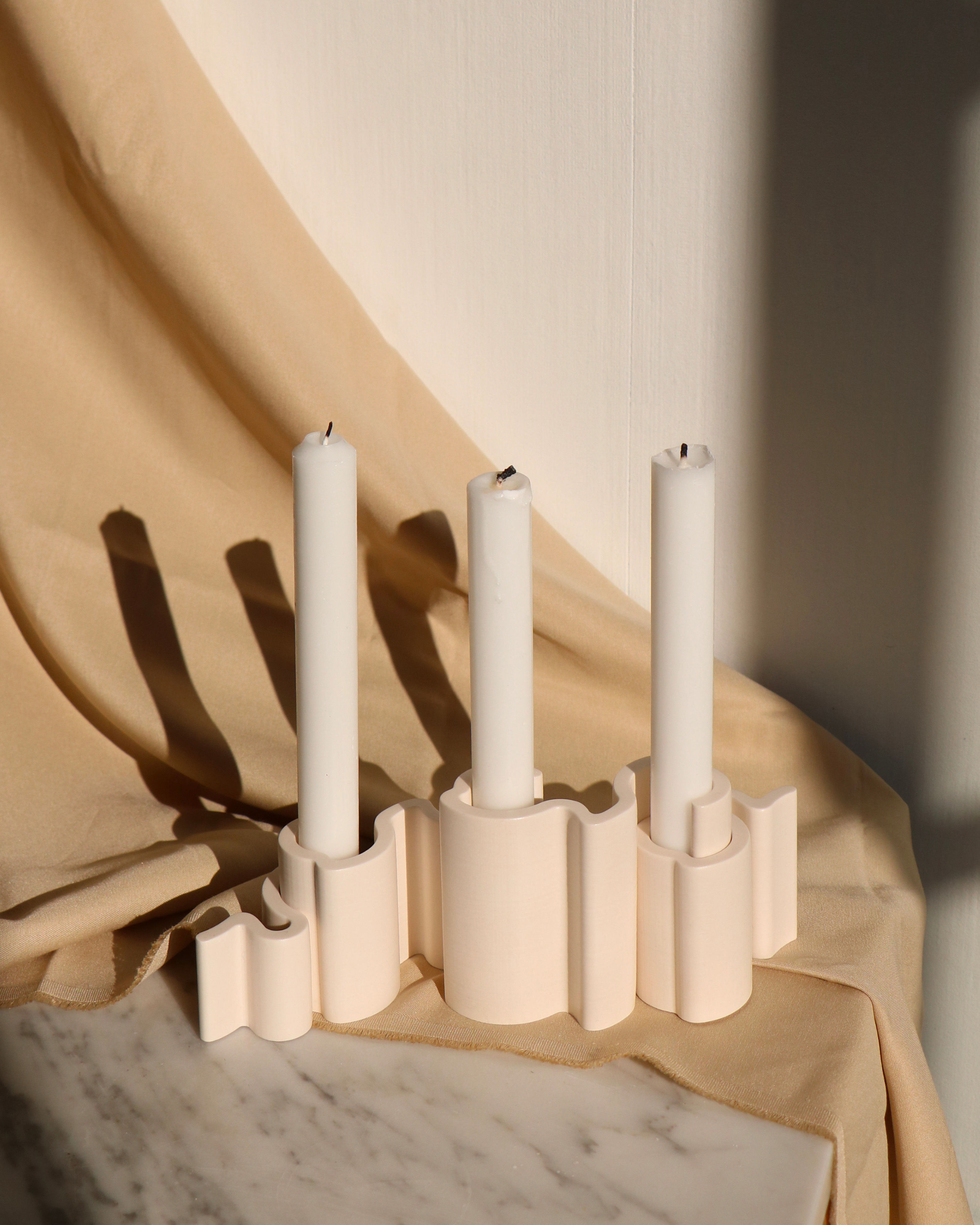 Architectural and playful, this modular candlestick set turns candlelight into an evolving composition. Four Jesmonite pieces in varying sizes interlock in multiple ways, with the candle itself serving as the keystone.