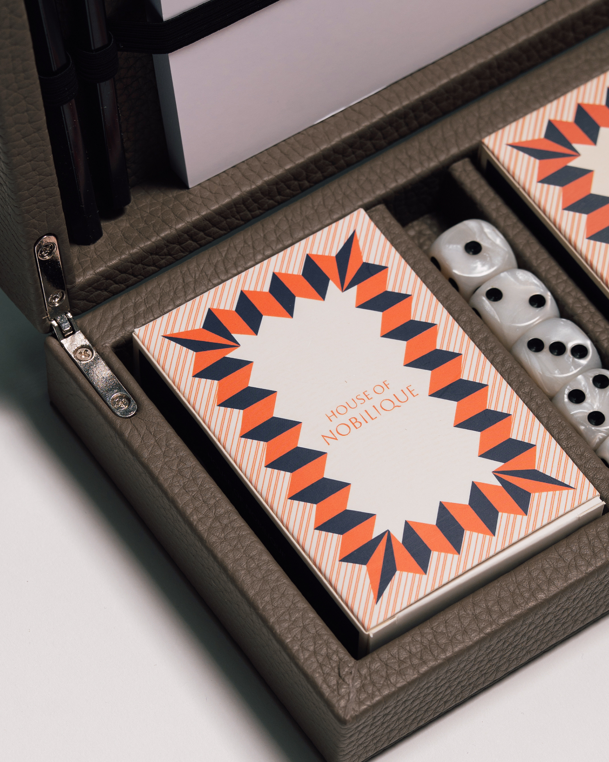 Caja de cartas de cuero hecha a mano, diseñada para viajar desde mesas de café hasta escapadas de fin de semana, lista para ser abierta siempre que la conversación se detenga y comience el juego. El cuero es estructurado pero flexible, diseñado para envejecer con belleza. En su interior, cada elemento tiene su lugar: dos barajas de cartas cuidadosamente diseñadas, cinco dados de resina, un cuaderno de puntuación estilo Yahtzee y papelería, todo ordenado de manera que el juego sea sencillo, y terminado con un discreto cierre magnético.