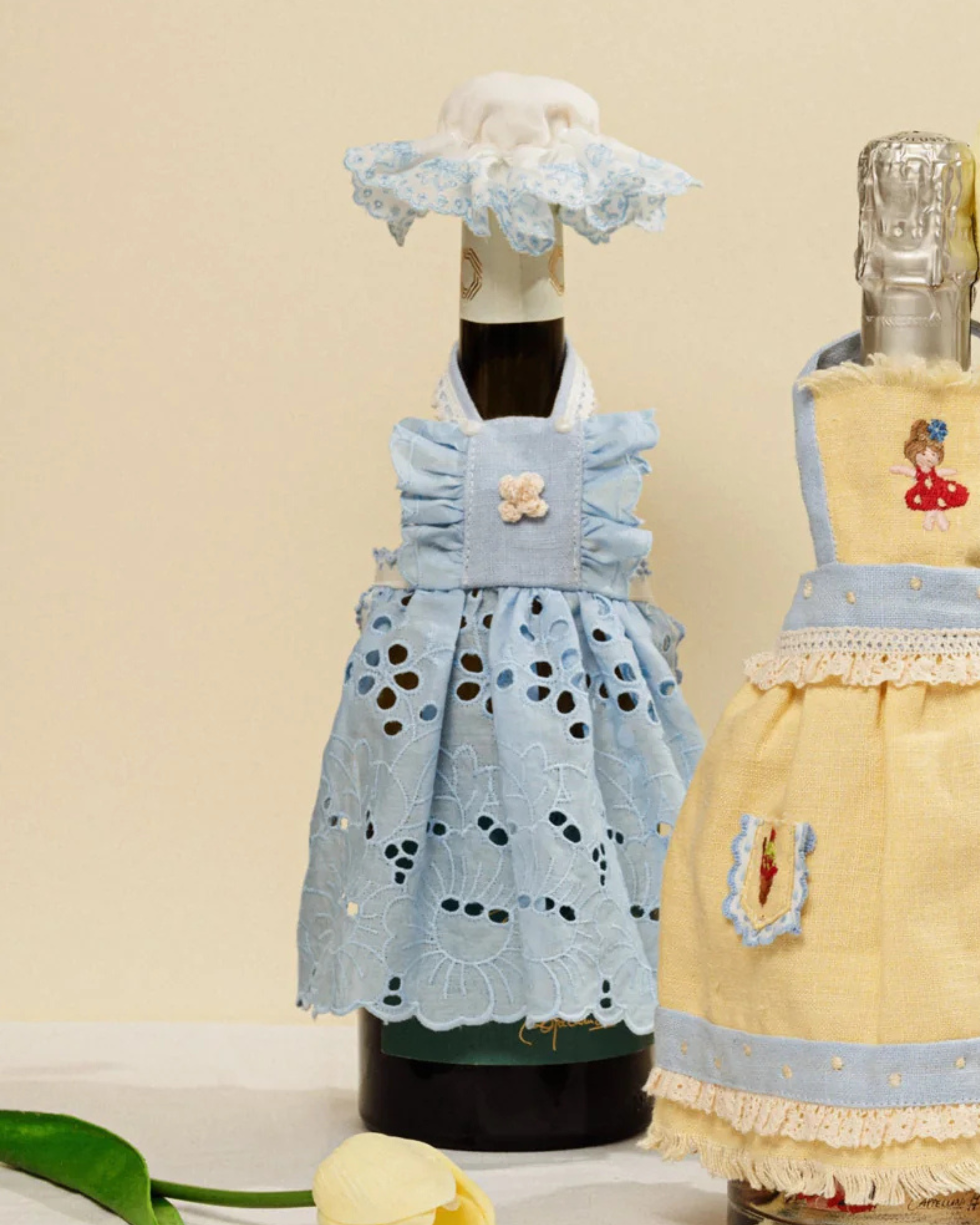 El delantal bordado de botella Waitress está inspirado en la elegancia discreta del servicio de mesa italiano, donde la decoración de la mesa se considera un arte en sí mismo. Elaborado en Italia con una mezcla de lino y bordado con fino algodón makò, se desliza sin esfuerzo sobre botellas de vino o champán, añadiendo una suave capa decorativa a los momentos compartidos alrededor de la mesa.