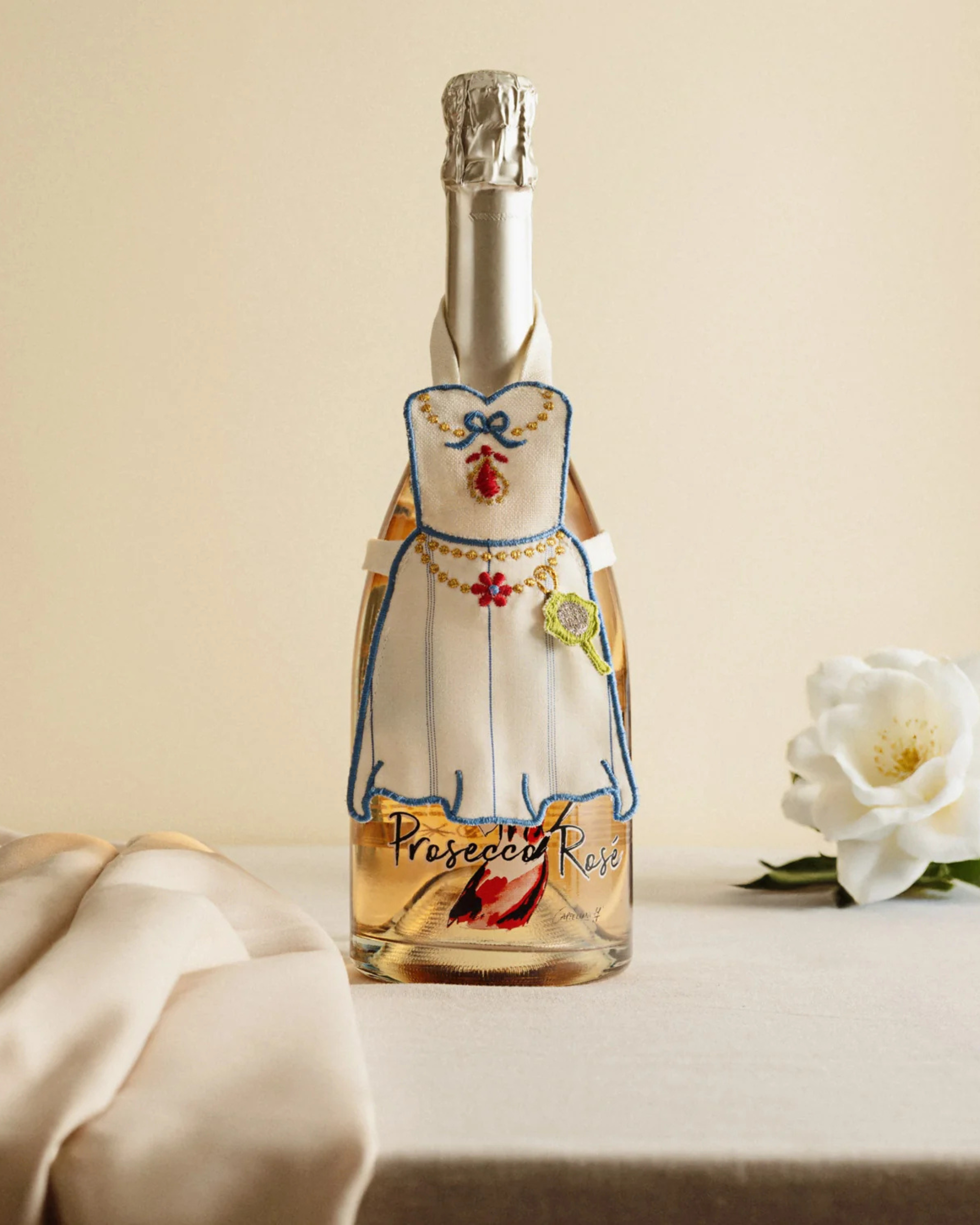 Elaborado en Italia con una mezcla de lino y bordado con fino algodón makò, el delantal para botellas Marchioness viste tu botella de vino o champán para la ocasión. El bordado añade carácter sin excesos, convirtiéndolo en un detalle decorativo que se siente seguro, intencionado y difícil de no amar.