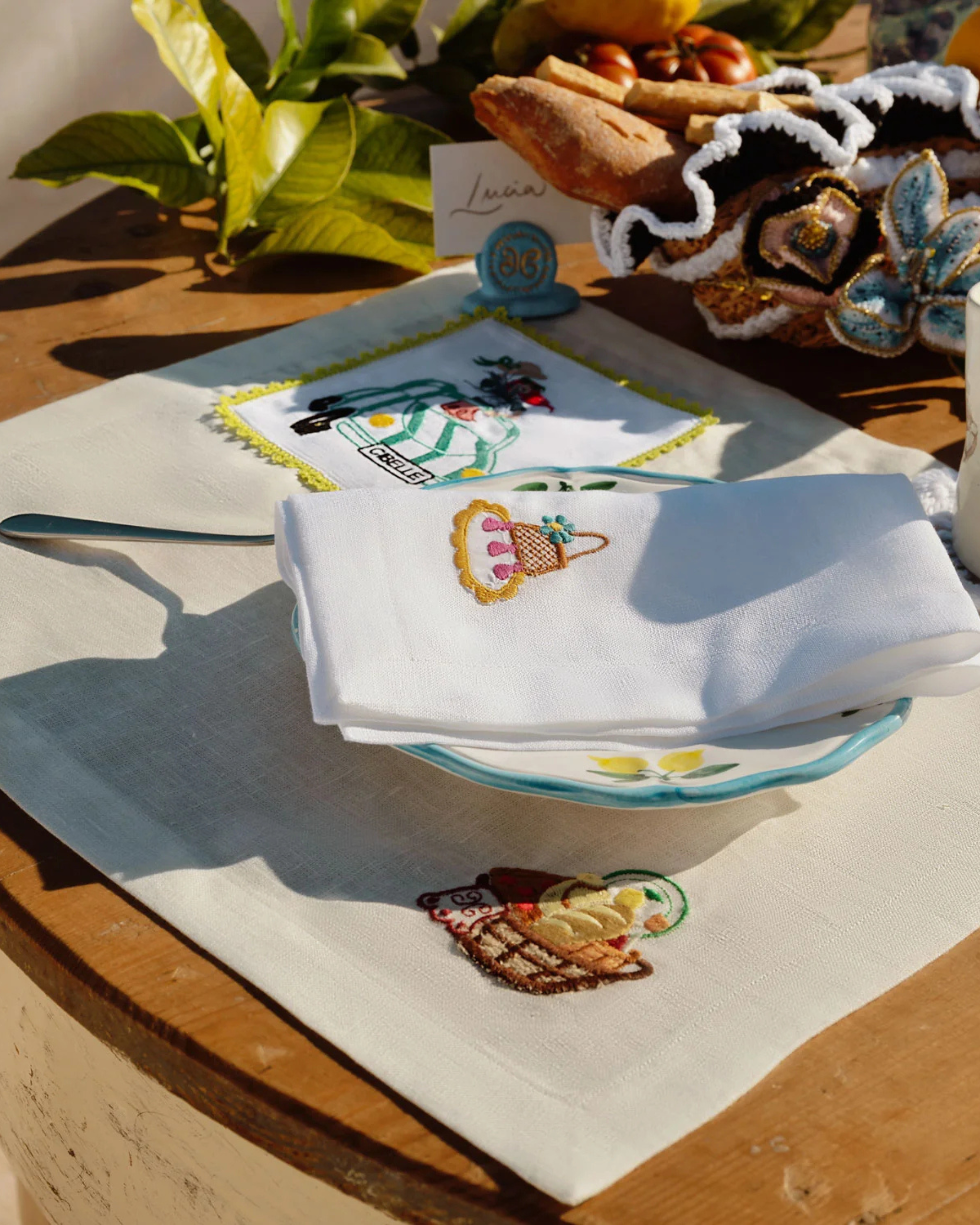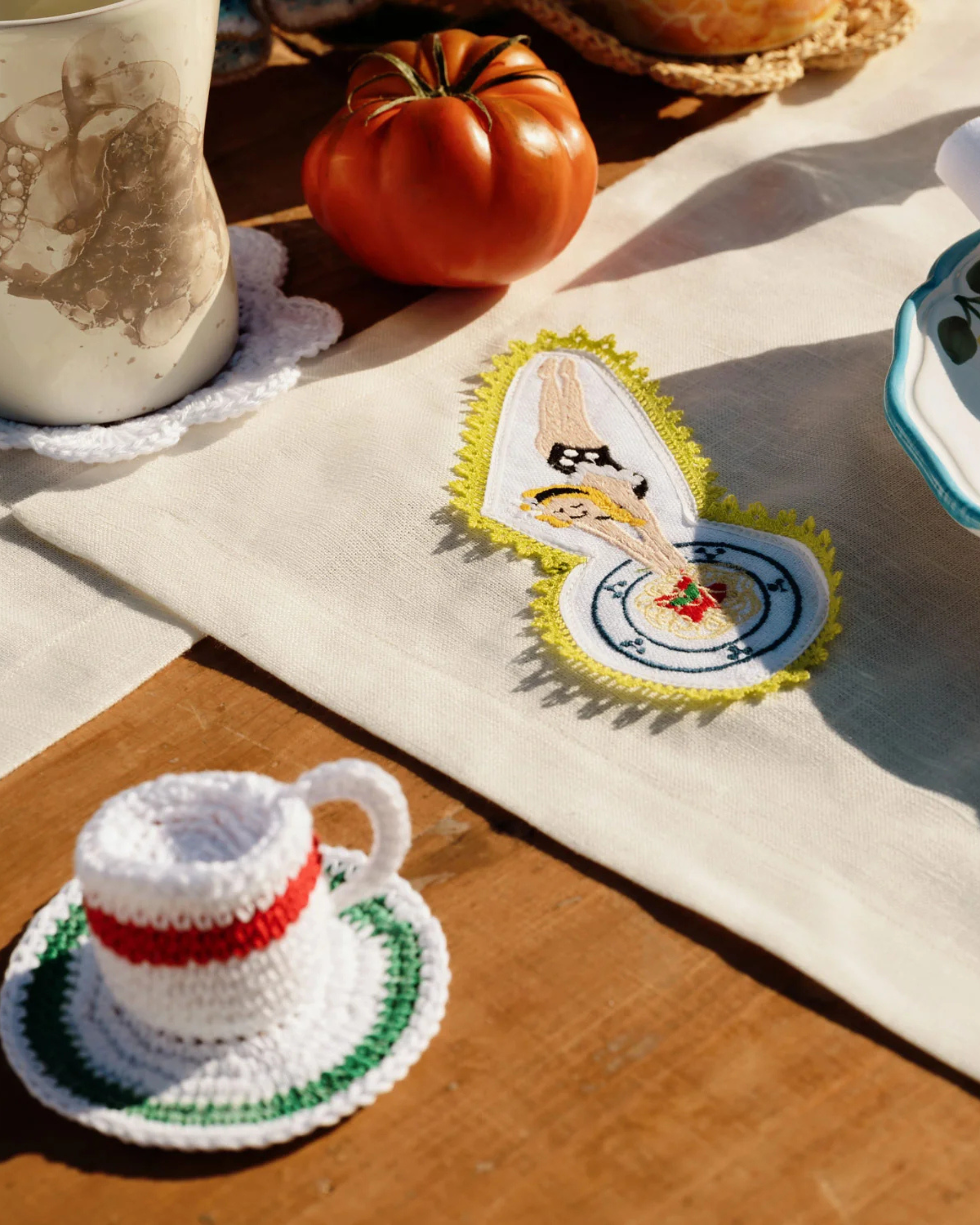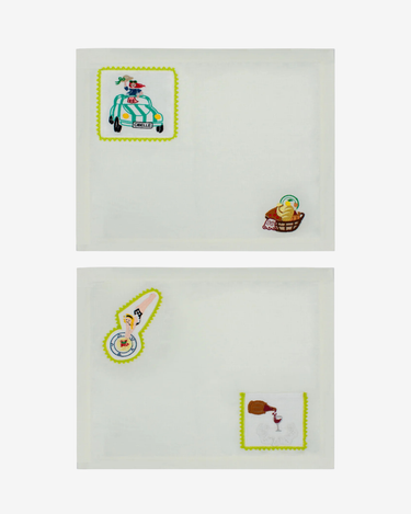 Pequeñas escenas bordadas aparecen en las esquinas, desde un paseo despreocupado hasta una niña zambulléndose de cabeza en un plato de espaguetis. Hecho a mano en Italia con una mezcla de lino y detallado con fino bordado de algodón makò, este juego de manteles individuales aporta un toque ilustrativo y narrativo a la mesa.