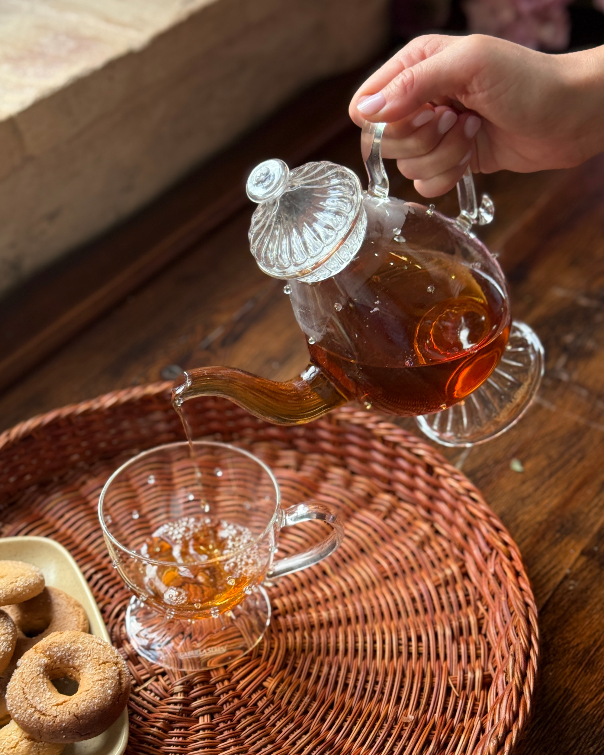 Hecho a mano por artesanos expertos en Bucarest, esta tetera de vidrio es un regalo considerado para un anfitrión, un amante del té o una ocasión especial como una boda. Su forma alta y escultórica presenta delicados lunares en relieve que capturan la luz, mientras que el pico acanalado, la tapa y la base añaden un toque refinado e inspirado en lo vintage.