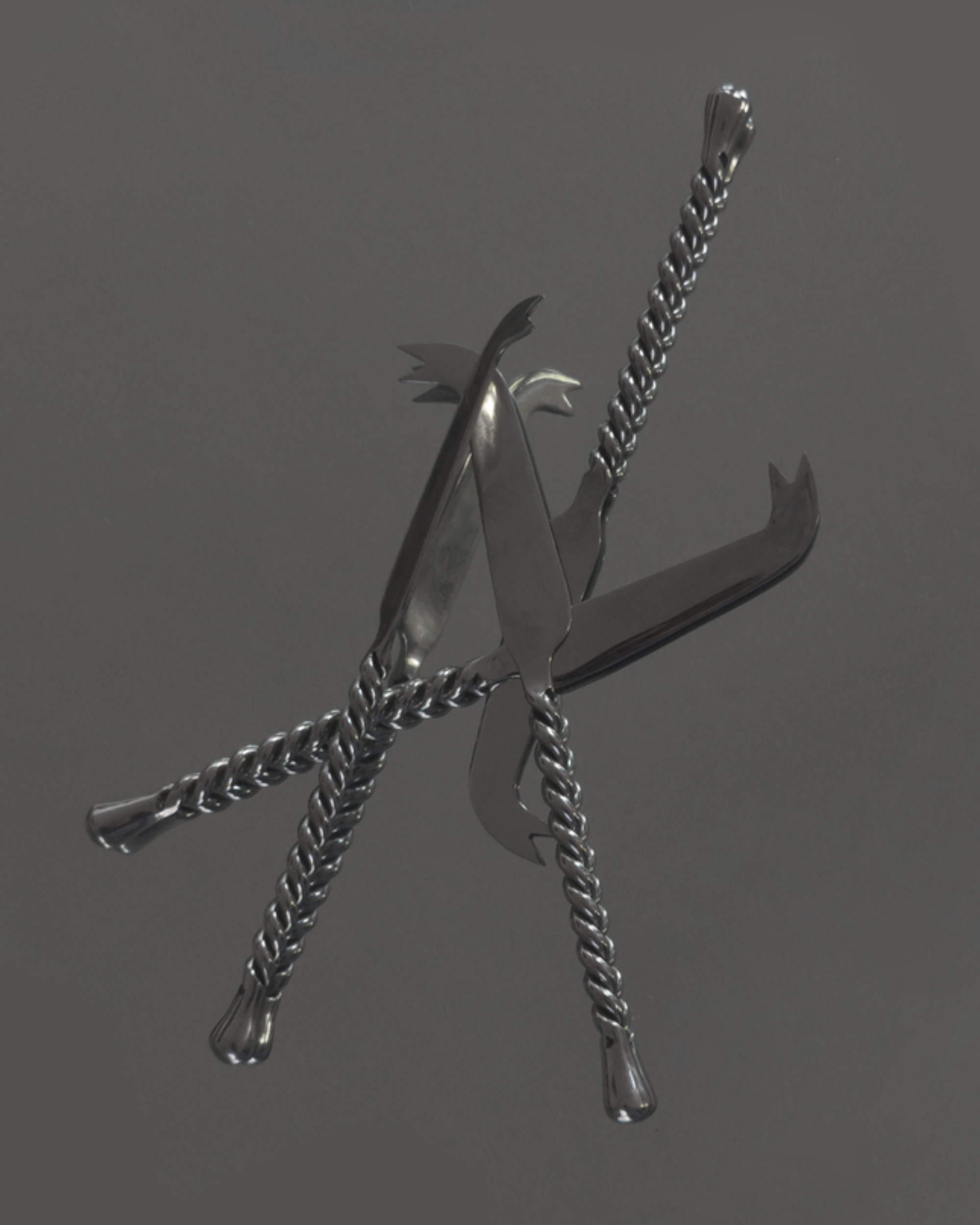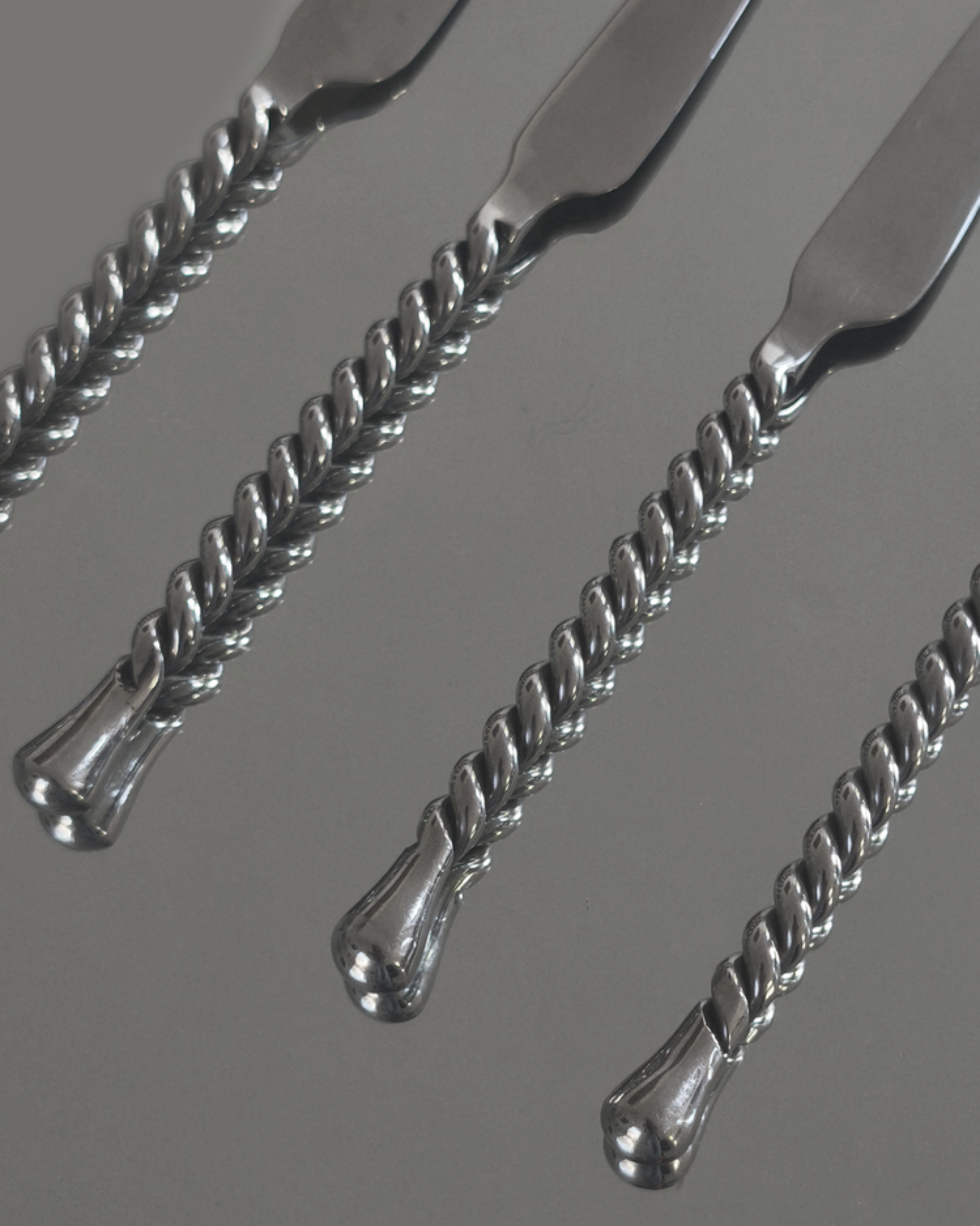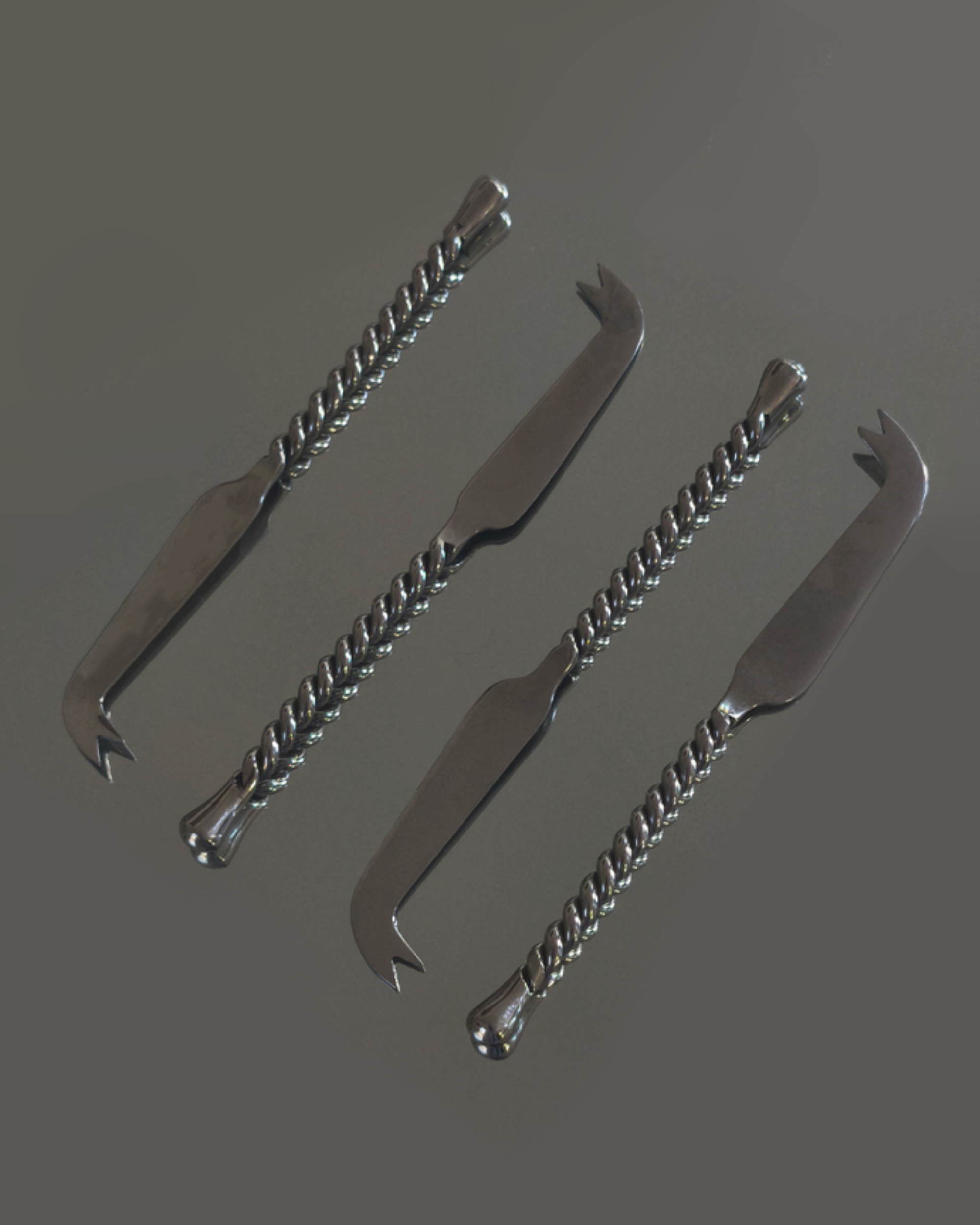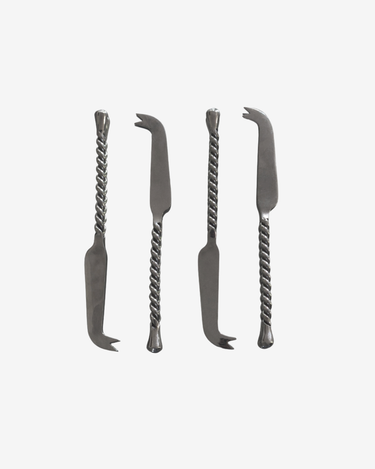 A refined set of four polished metal cheese knives with twisted handles. Each piece balances form and function beautifully, making them a timeless addition to any cheese board or gathering.