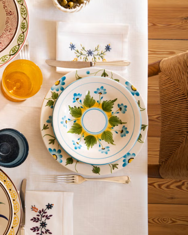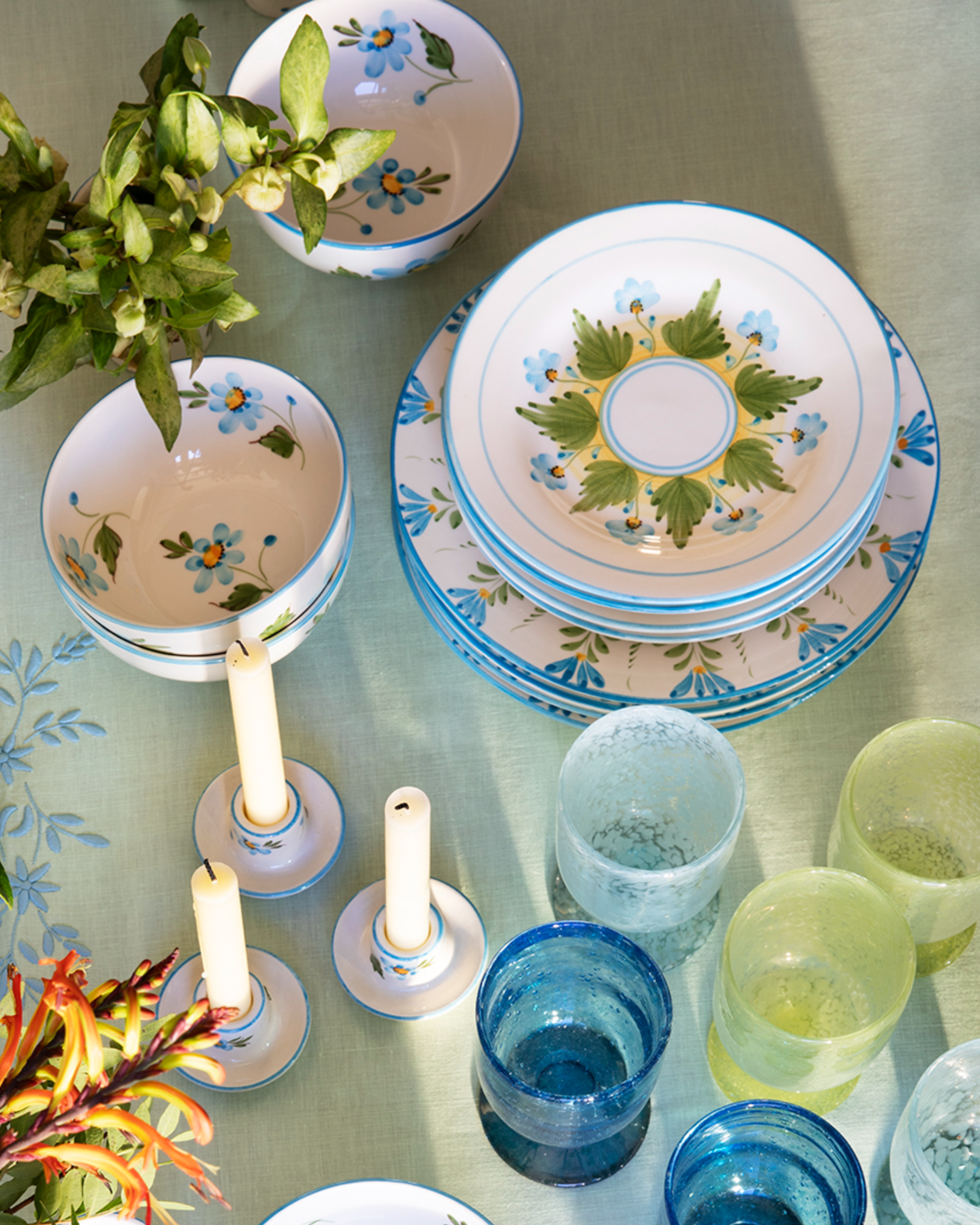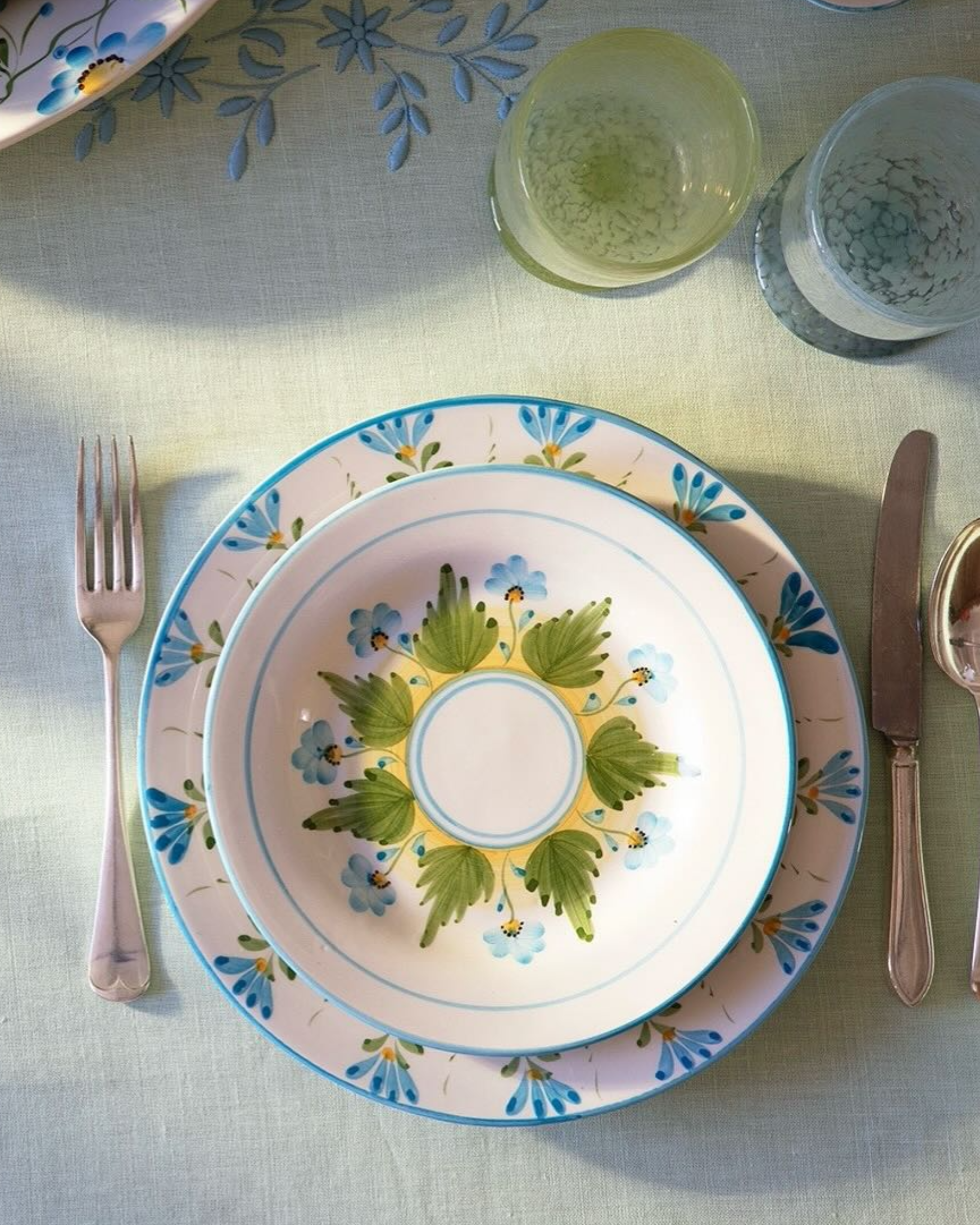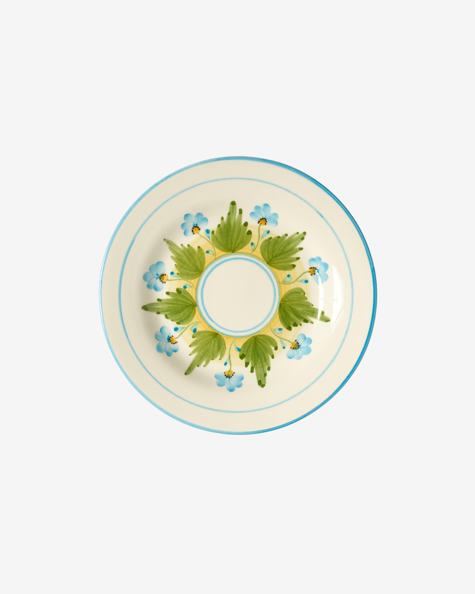 Turquoise flowers and bright green leaves in a design that feels fresh, easy, and full of light. Each plate is shaped in earthenware, painted freehand by skilled artisans, then glazed and kiln-fired. The soft blue rim gently frames the floral centre, while small variations in every brushstroke make each piece quietly unique.