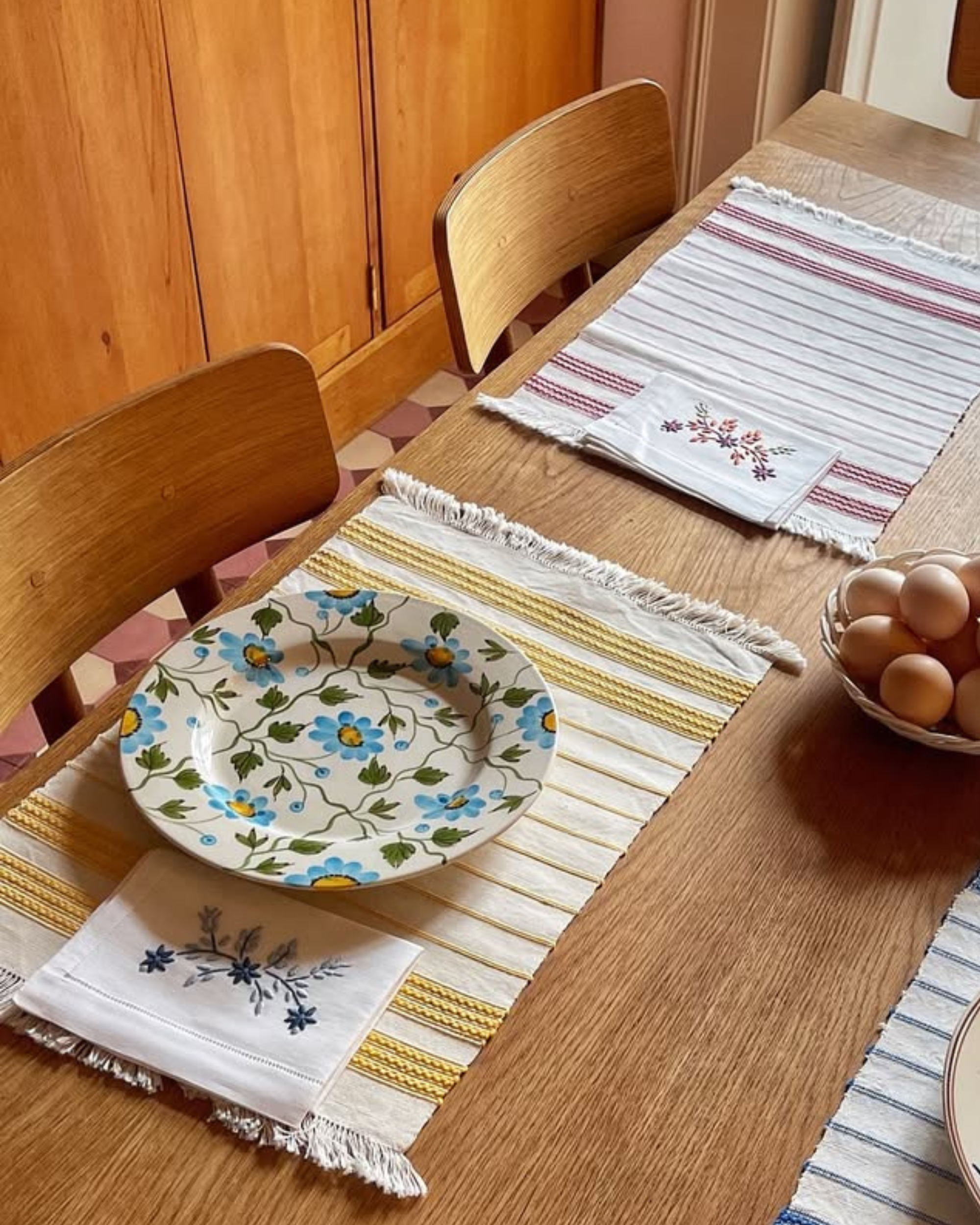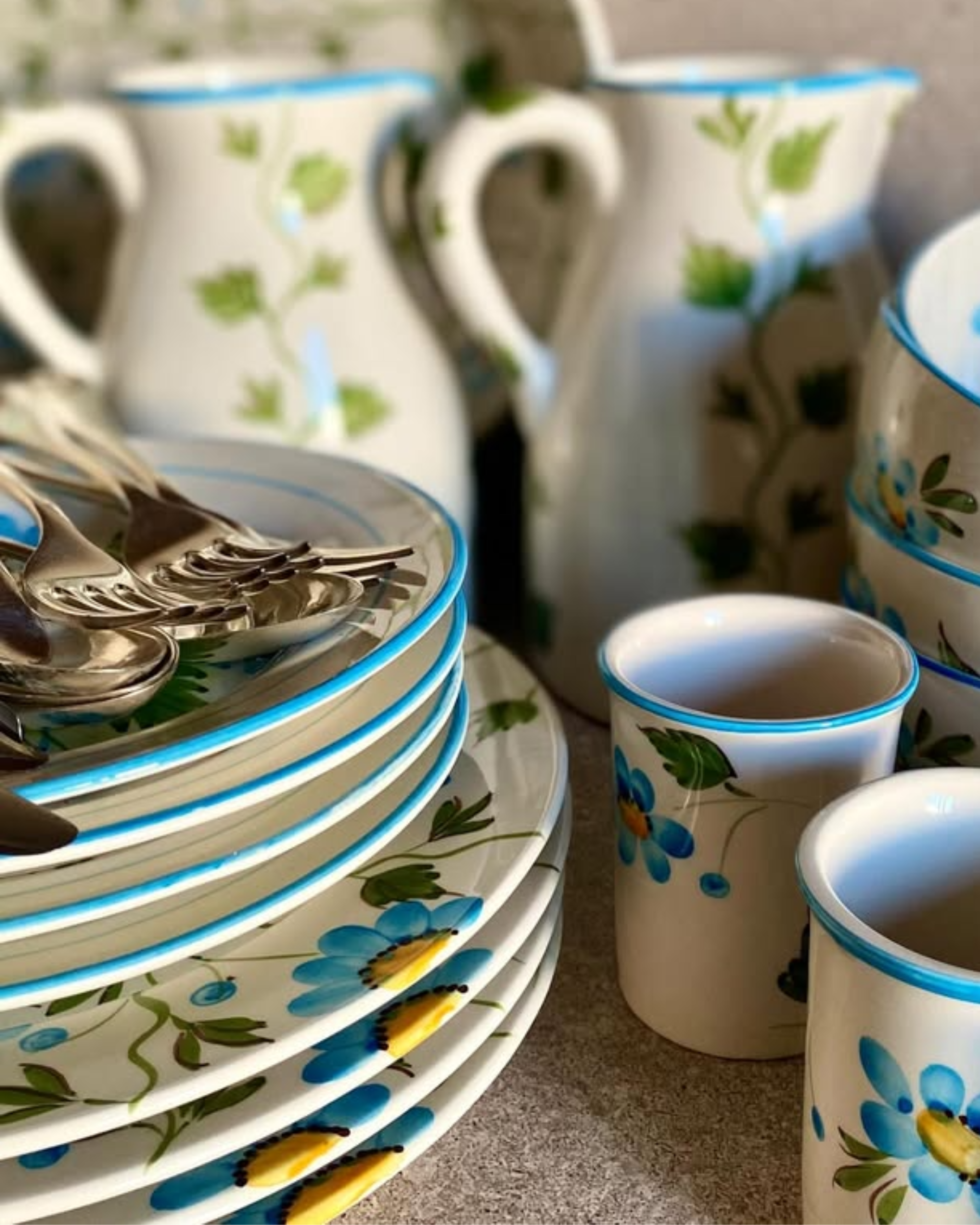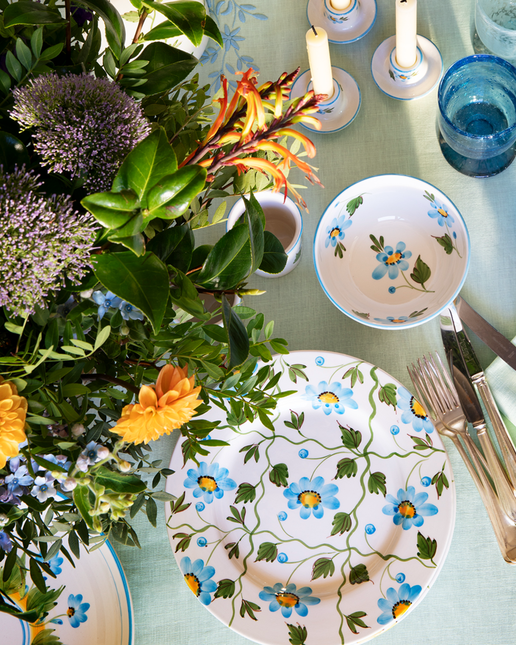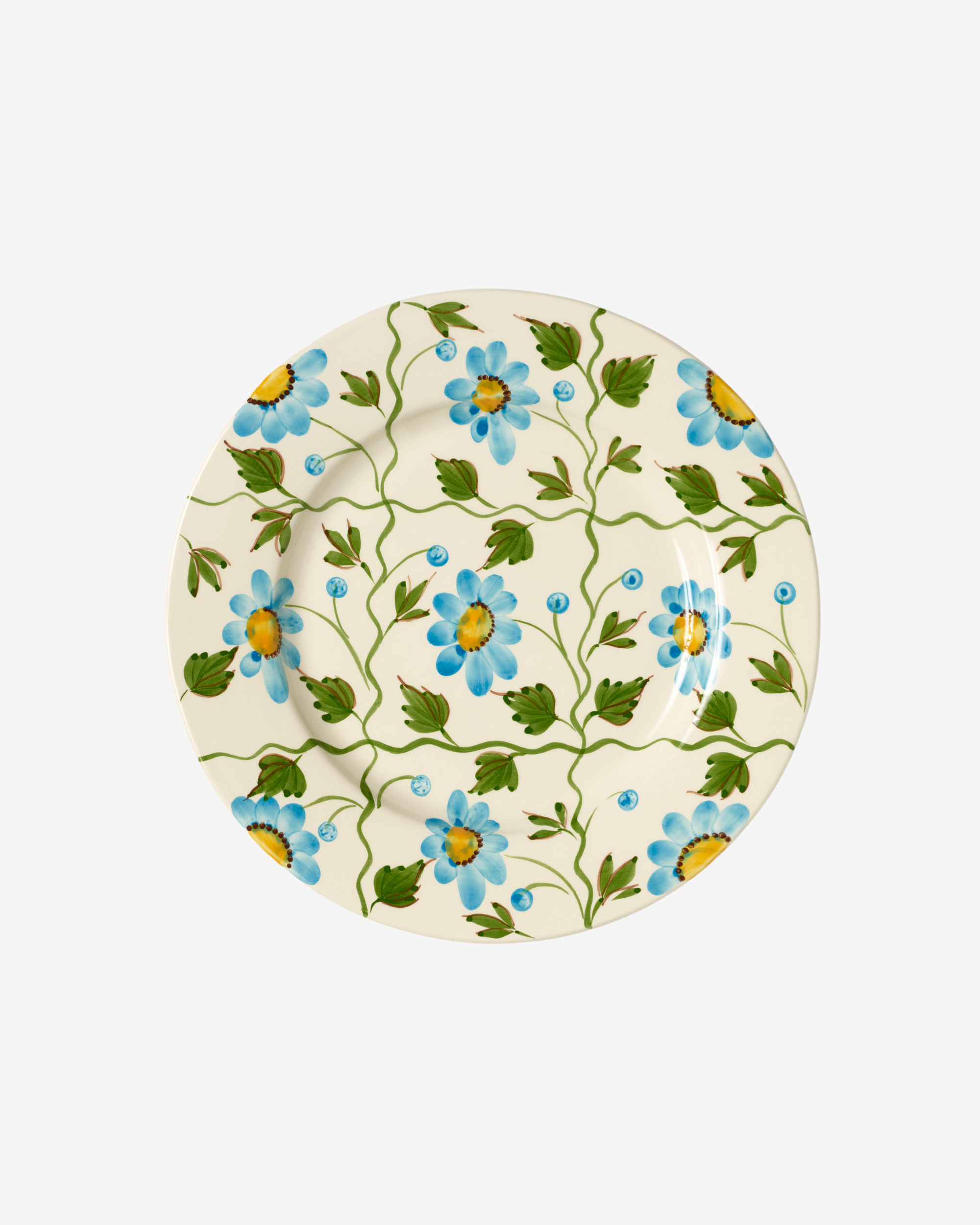 Individually shaped in earthenware, each plate is painted freehand by skilled artisans before being glazed and kiln-fired. Turquoise-blue blossoms unfold across the surface in a composition that feels both rooted in tradition and vividly alive. Subtle variations in every brushstroke ensure no two pieces are ever identical. At 27 cm in diameter, it is generously scaled for main courses.