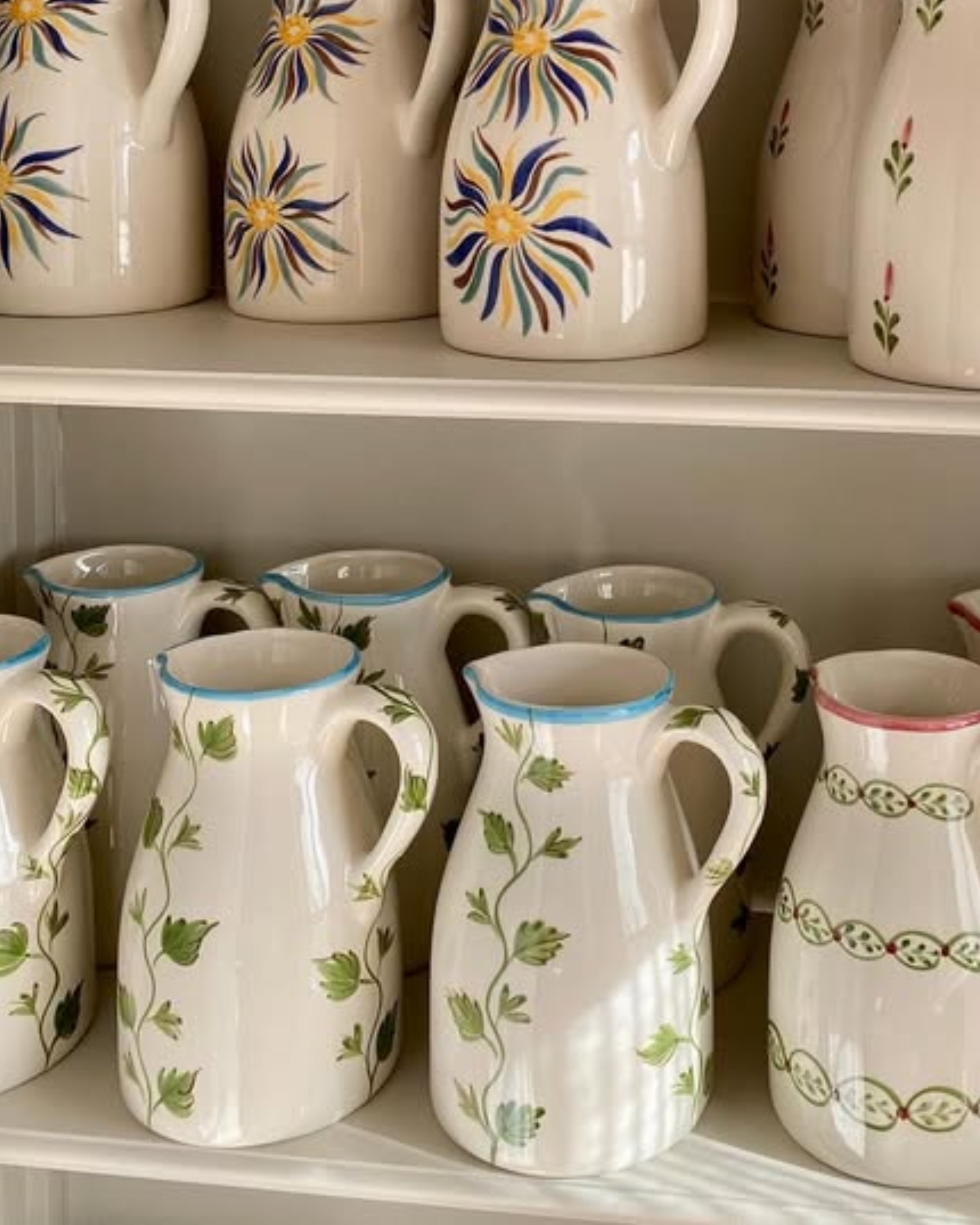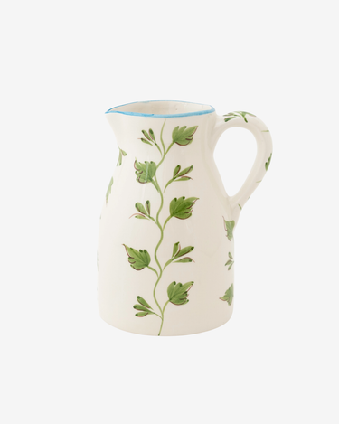 Crafted in glazed earthenware and painted freehand by skilled artisans, this pitcher is a romantic, light-filled addition to any table, whether holding water, wine, or freshly cut flowers. Soft green leaves trail gently across the surface, their fluid stems climbing upward beneath a fine turquoise rim. The shape is generous yet elegant, with a curved handle designed for easy pouring.