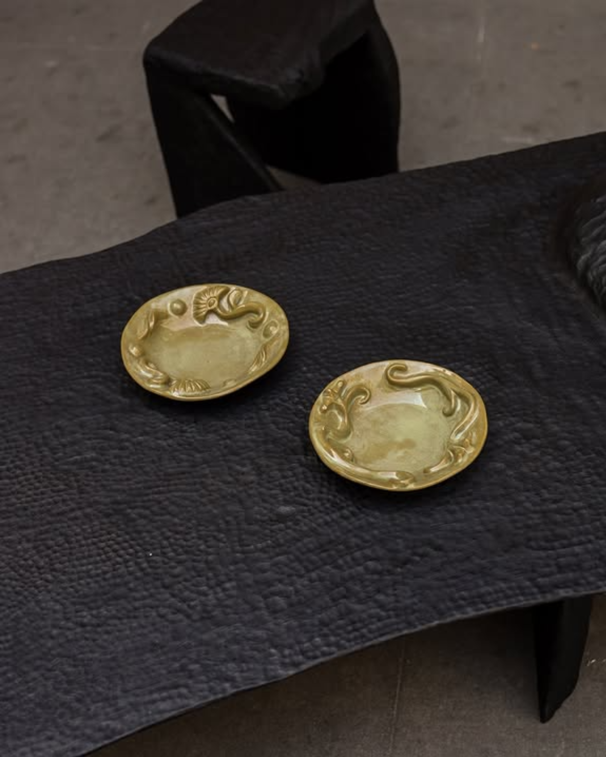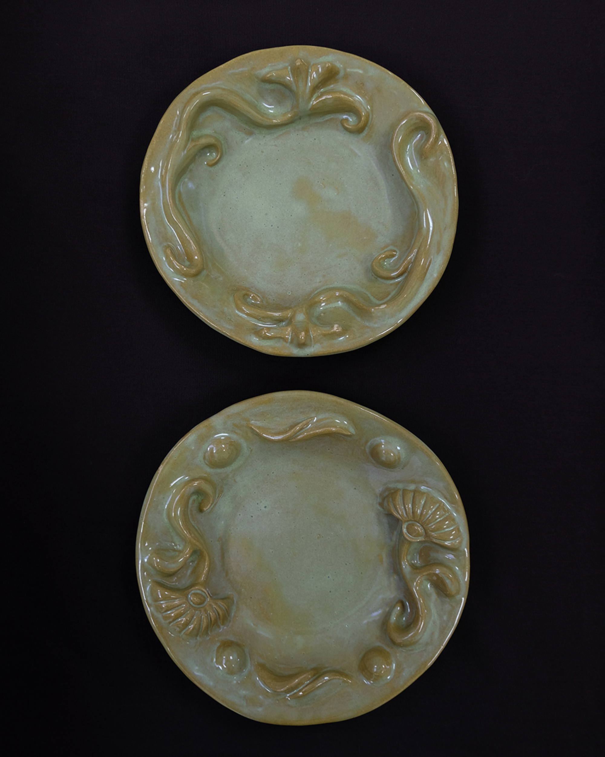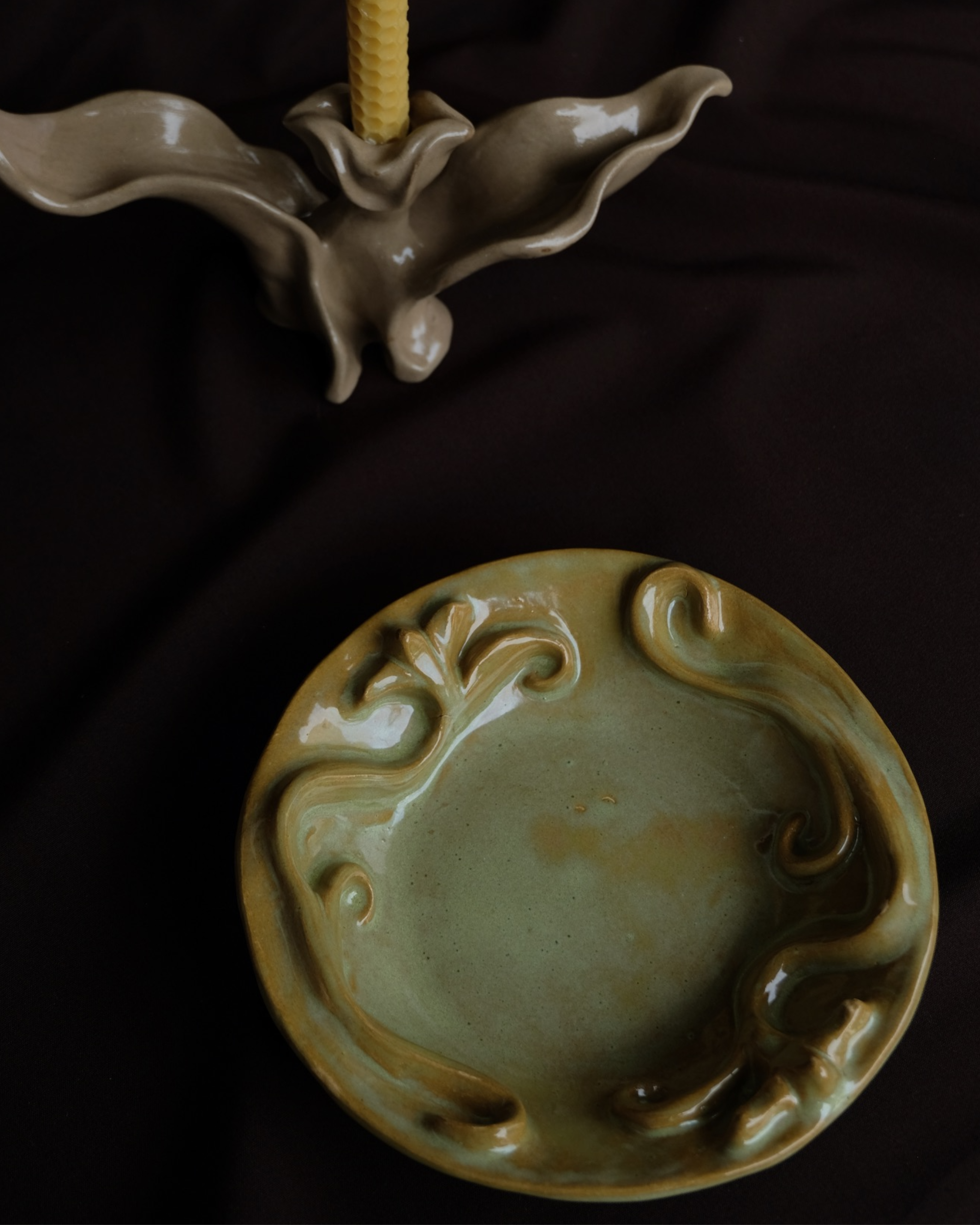 Organic reliefs and botanical curves shape these handcrafted ceramic plates, inspired by Barcelona’s ornamental architecture and the quiet observation of plants and flowers.