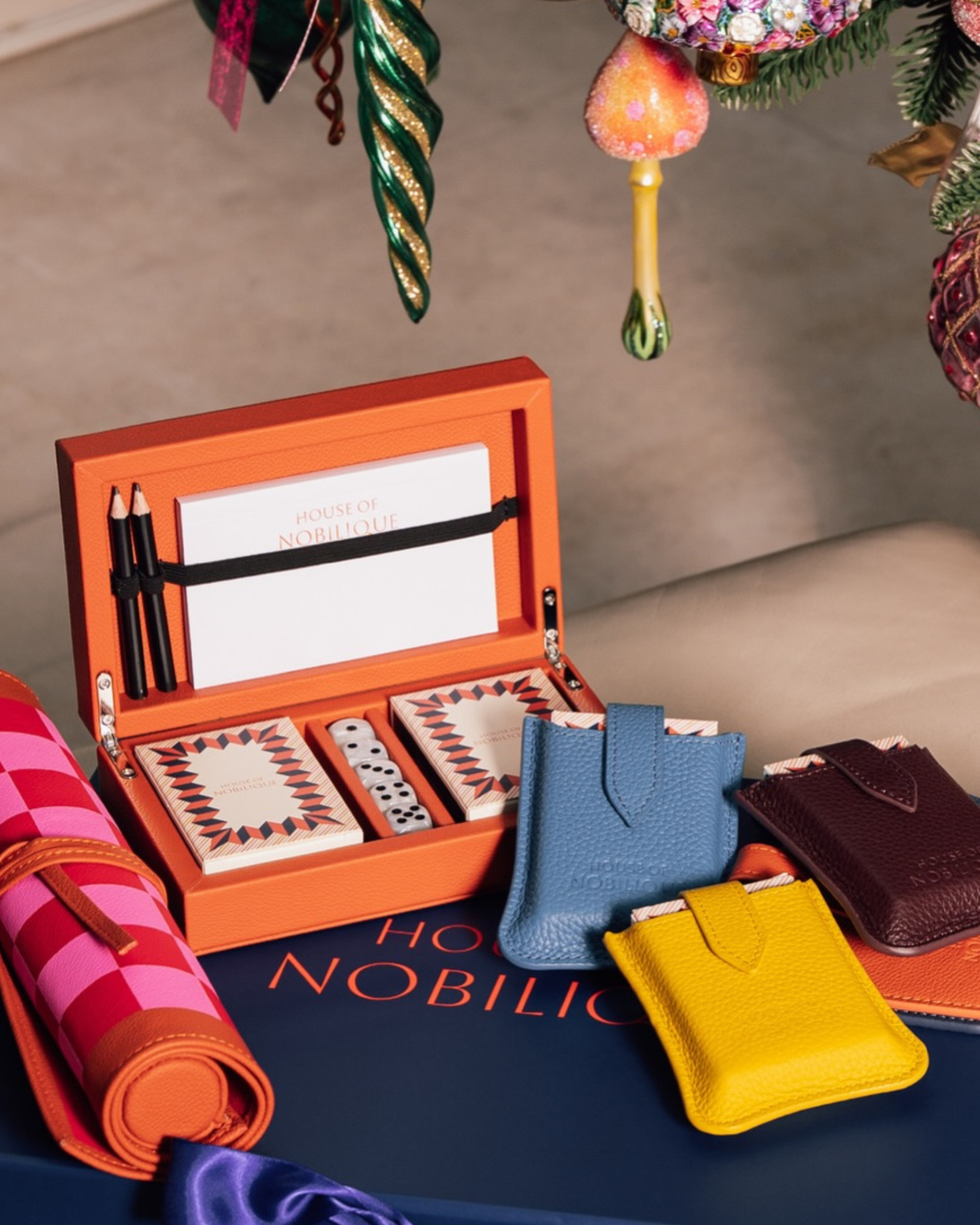 Handcrafted from smooth, genuine leather in rich shades of green, orange, burgundy, and blue, this leather card set opens to reveal two premium decks of playing cards, five dice, a notepad, and sharpened pencils. The compact form and magnetic closure make it ideal for travel or home use, while the natural grain of the leather gives each box its own quiet character. A refined and personal gift for game lovers, hosts, or anyone who appreciates the little rituals done well. Available on Treatts in 5 colours.