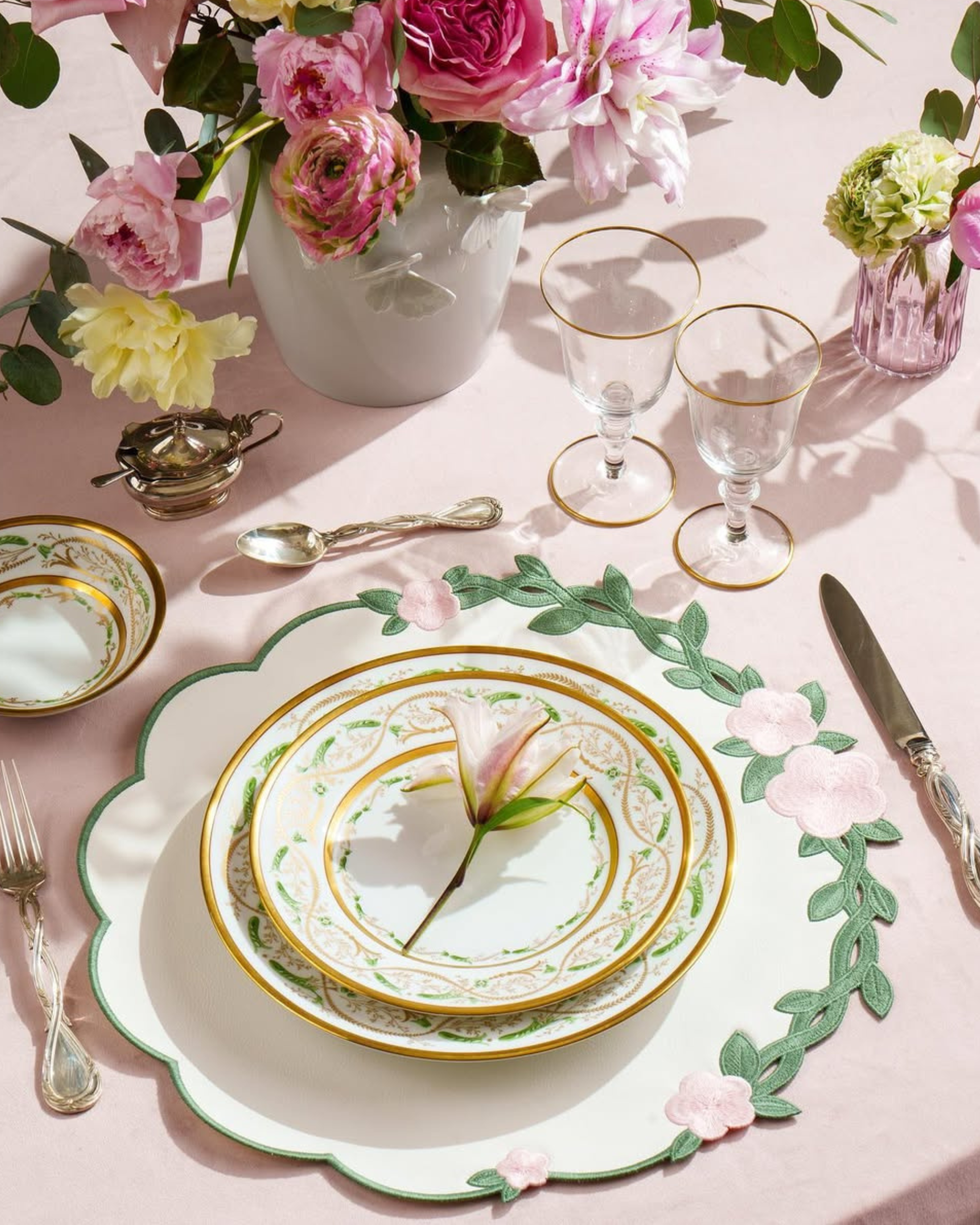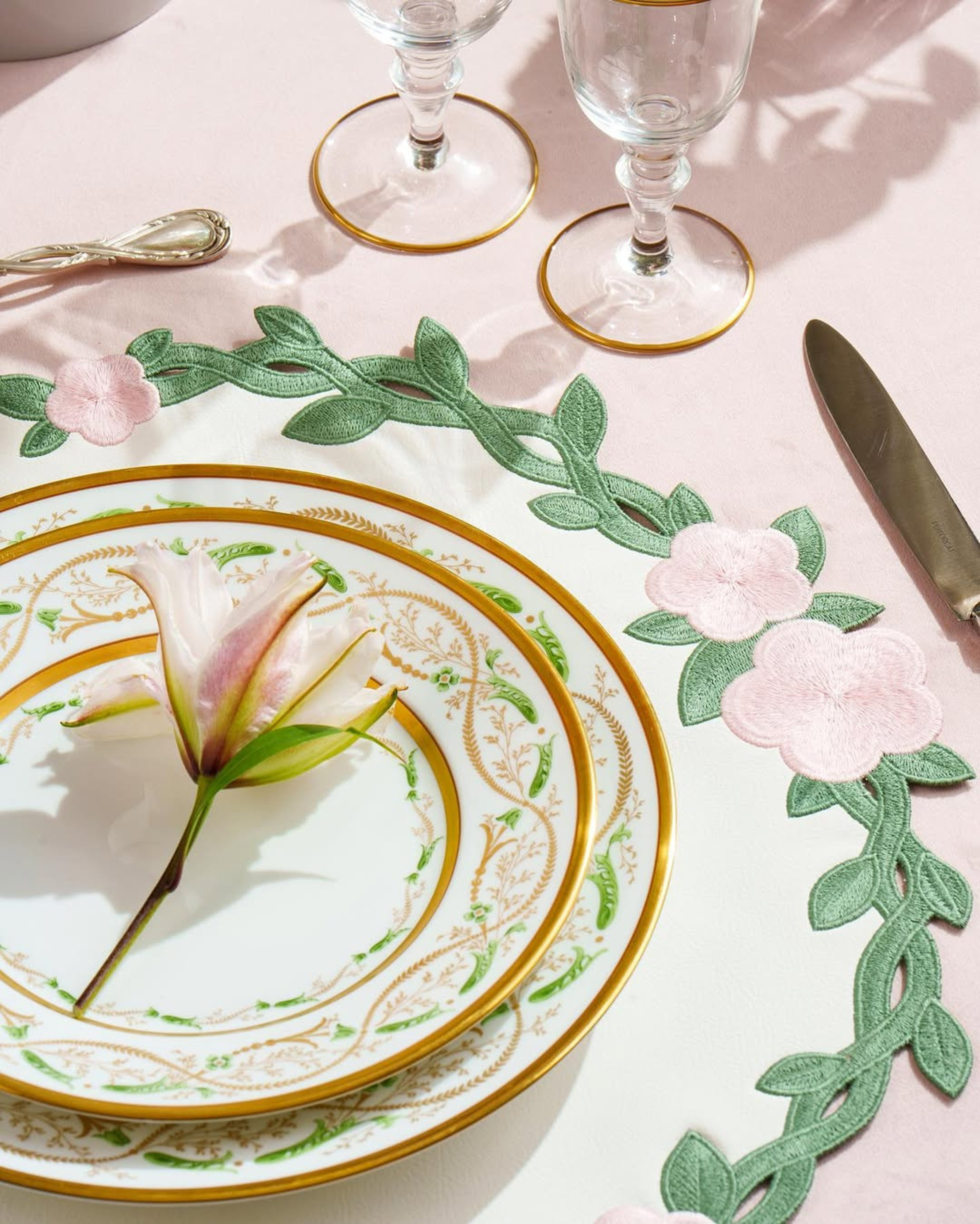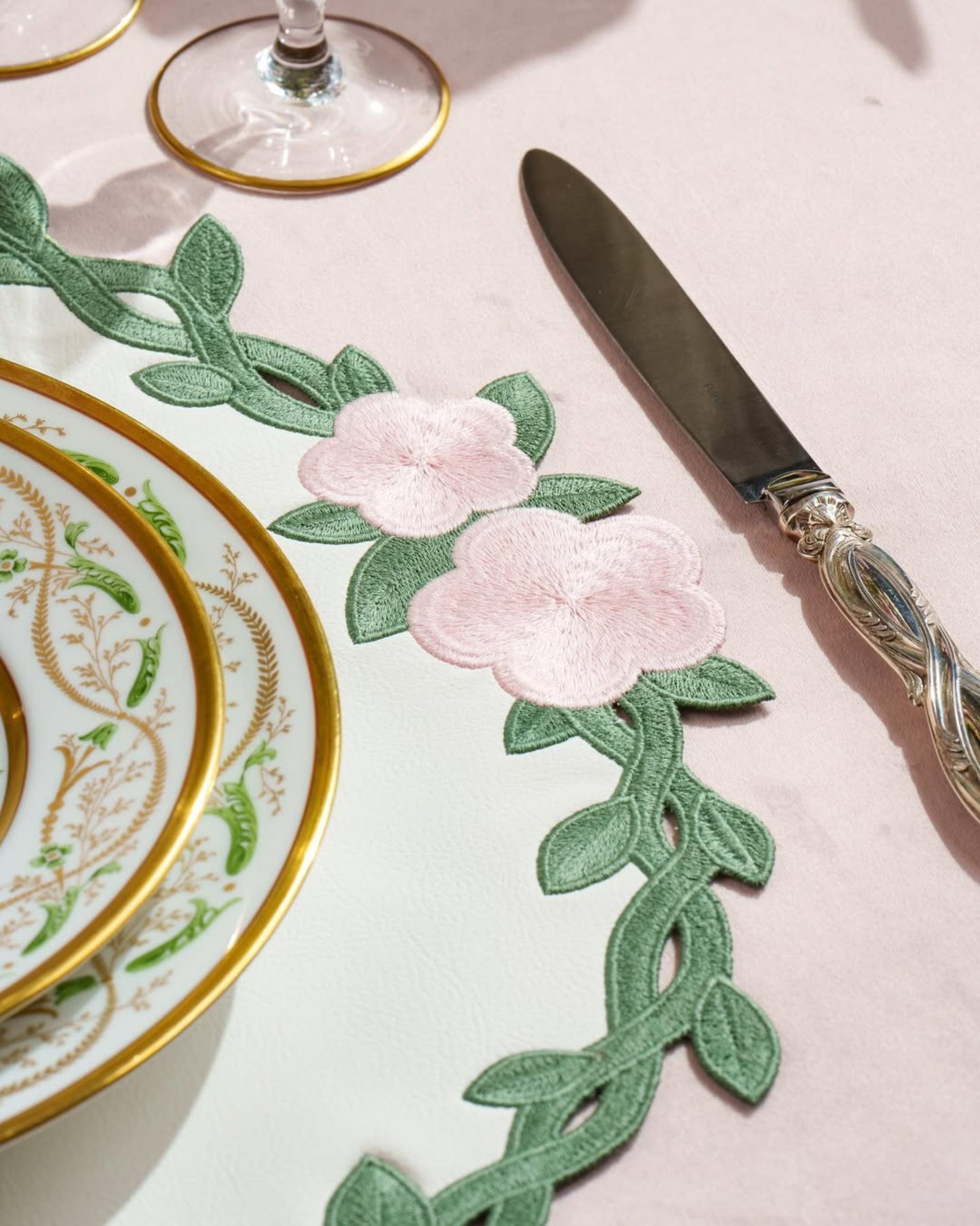The Meadow placemats capture the charm of a spring garden in bloom. Crafted in Latvia from fine faux leather, they feature delicately embroidered green leaves and pale pink flowers along the border. Both decorative and durable, they create a soft, elegant backdrop for dining throughout the seasons.