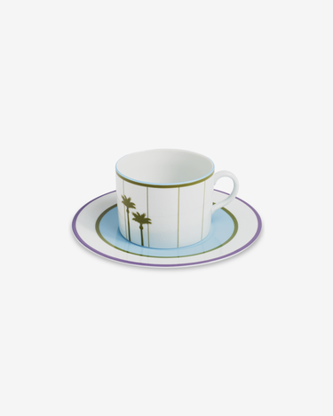 The Breakfast Club cup and saucer set turns a simple morning ritual into a design statement. Made in Portugal from fine porcelain, its smooth form and gentle palette reflect the calm of early light. The palm motif brings a subtle sense of place and warmth, while the fine border detailing adds a note of structure.