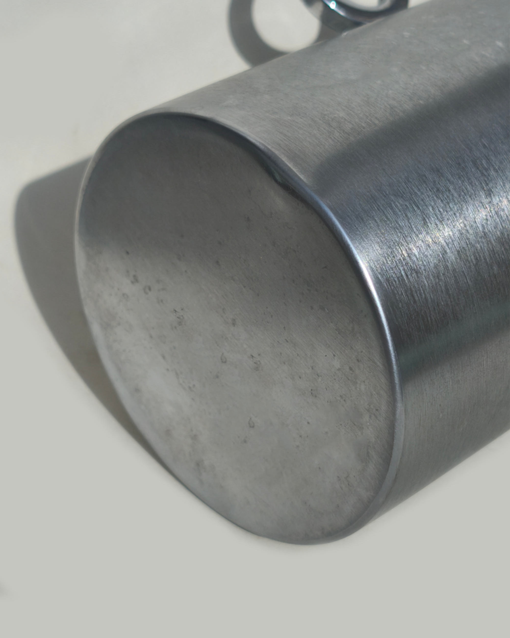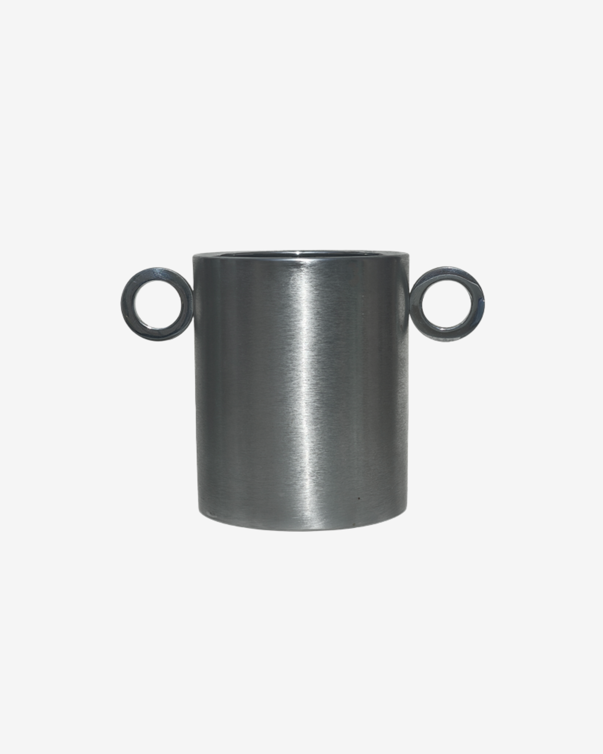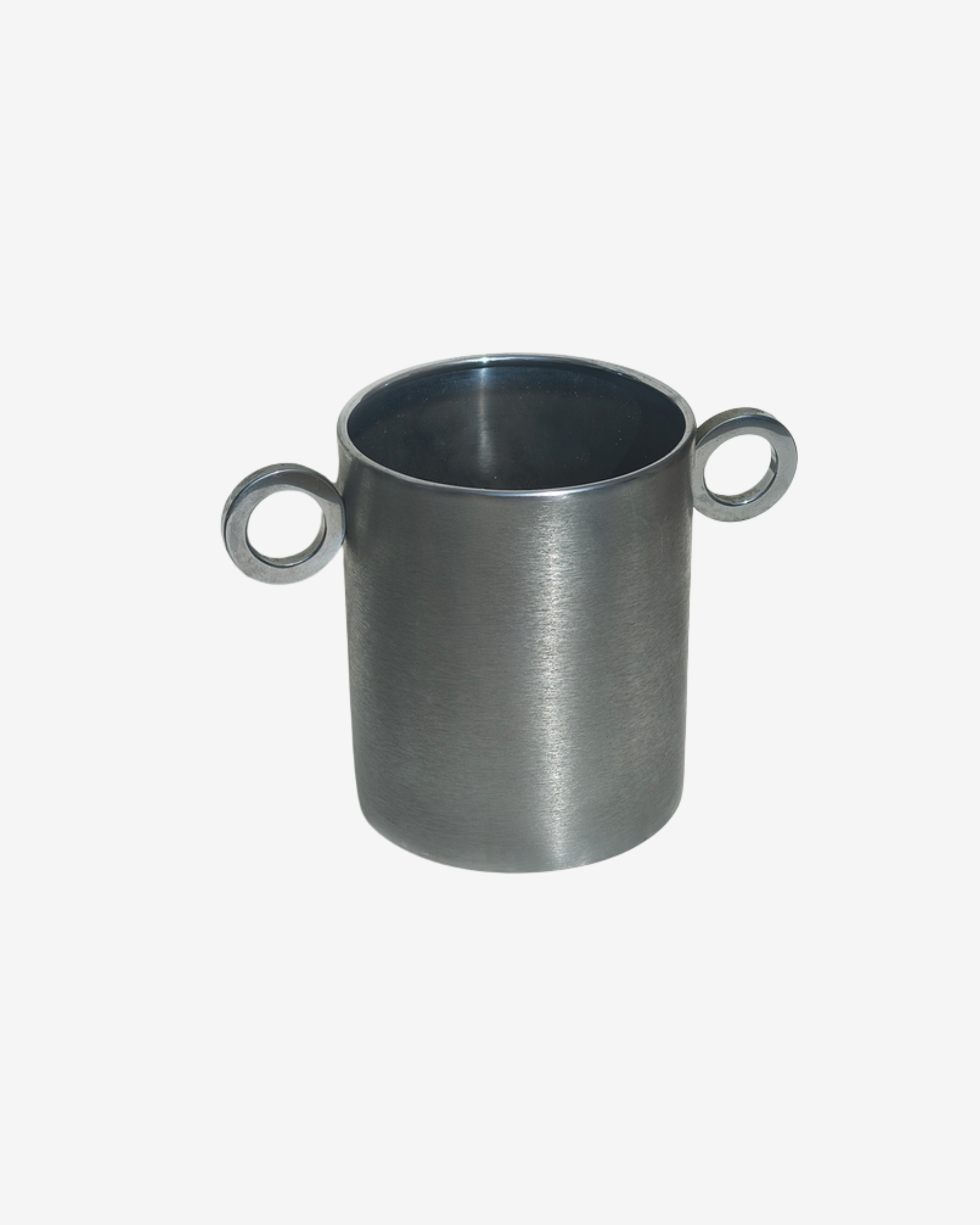 A sleek stainless steel ice bucket defined by its sculptural ring handles and clean, cylindrical silhouette. Its polished surface and minimalist geometry recall the elegance of Italian modernist design — practical yet undeniably refined. A small dent at the base adds to its authentic, timeworn charm.