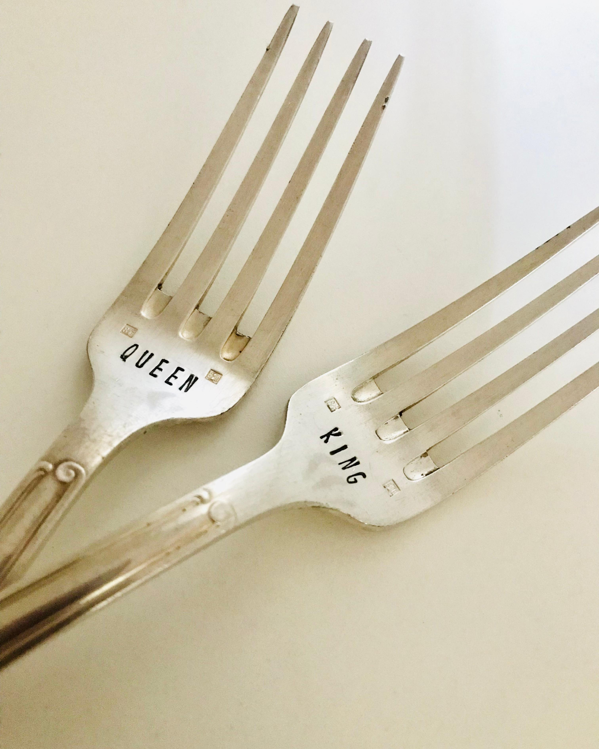 Add a regal touch to everyday dining with this set of two vintage silver forks. Carefully repurposed from preloved silver-plated cutlery and hand-stamped with King and Queen, each fork carries the soft patina and gentle marks of its history, making them as unique as the couple they celebrate.